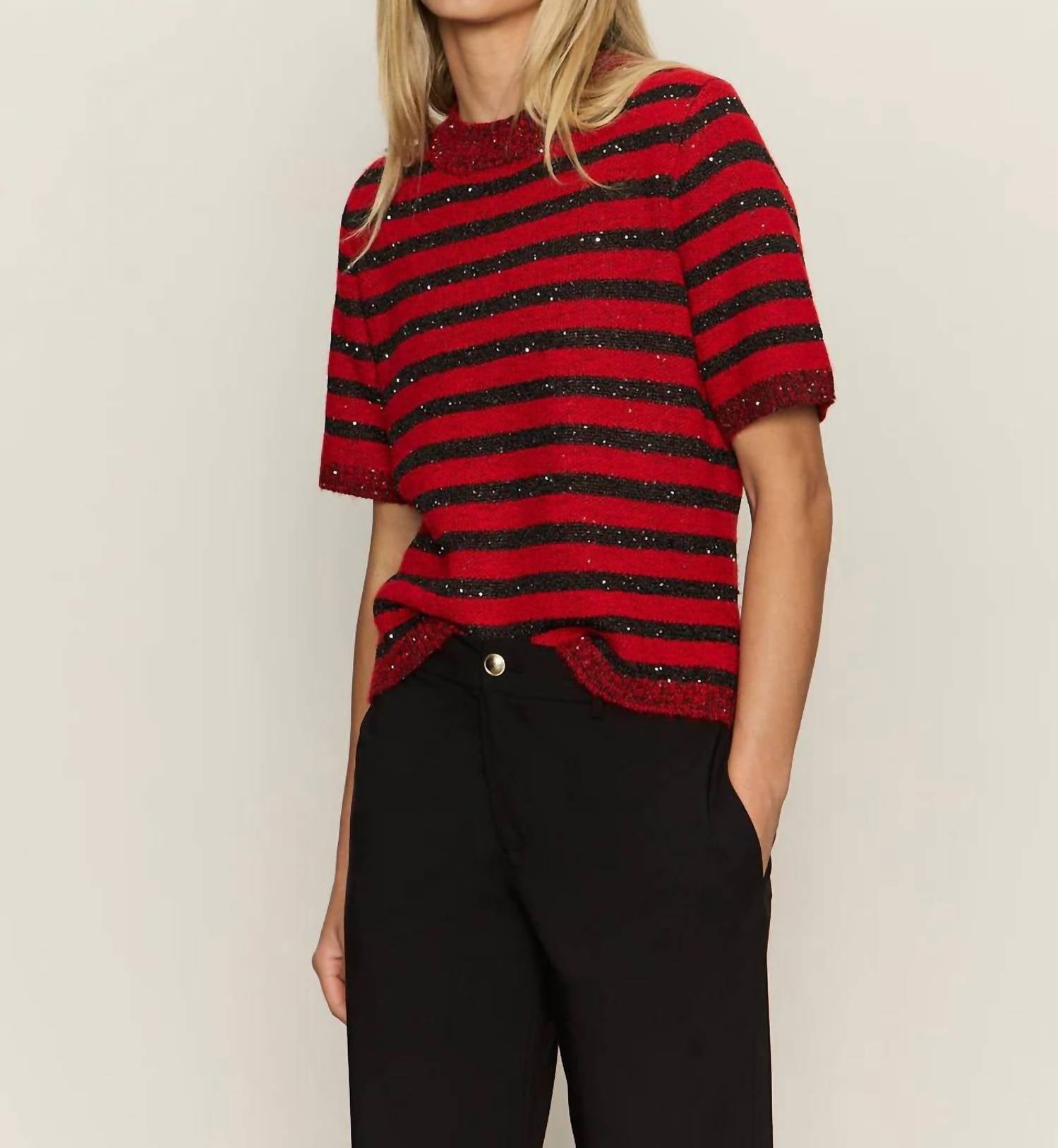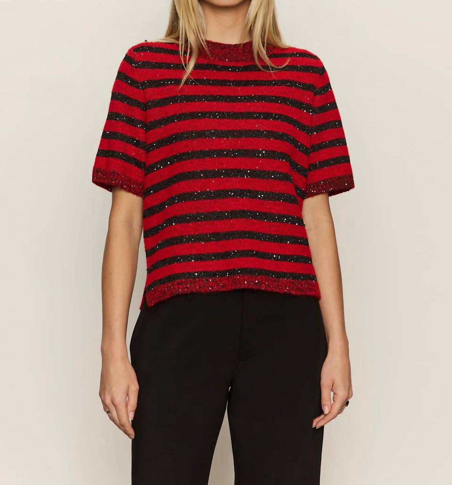 The ultimate go-to sweater, expertly crafted to provide the perfect combination of warmth and style. Its classic design and soft fabric make it a must-have addition to your wardrobe. Embrace the holiday season with the Sanctuary Short Sleeve Shine Sweater, an effortlessly chic choice for any festive occasion. This crewneck tee features short sleeves and is crafted from a luxurious blend of 87% polyester, 10% nylon, and 3% wool for ultimate comfort and style. Designed without pockets for a streamlined look, this sweater comes in a striking Cherry Lacquer color and offers a trendy stripe pattern. Closure is a simple pull-on style, and for best care, hand wash cold and line dry. Model is 5'9" and wears size S with a front length of 21", bust of 36", and sleeves measuring 18 1/4".