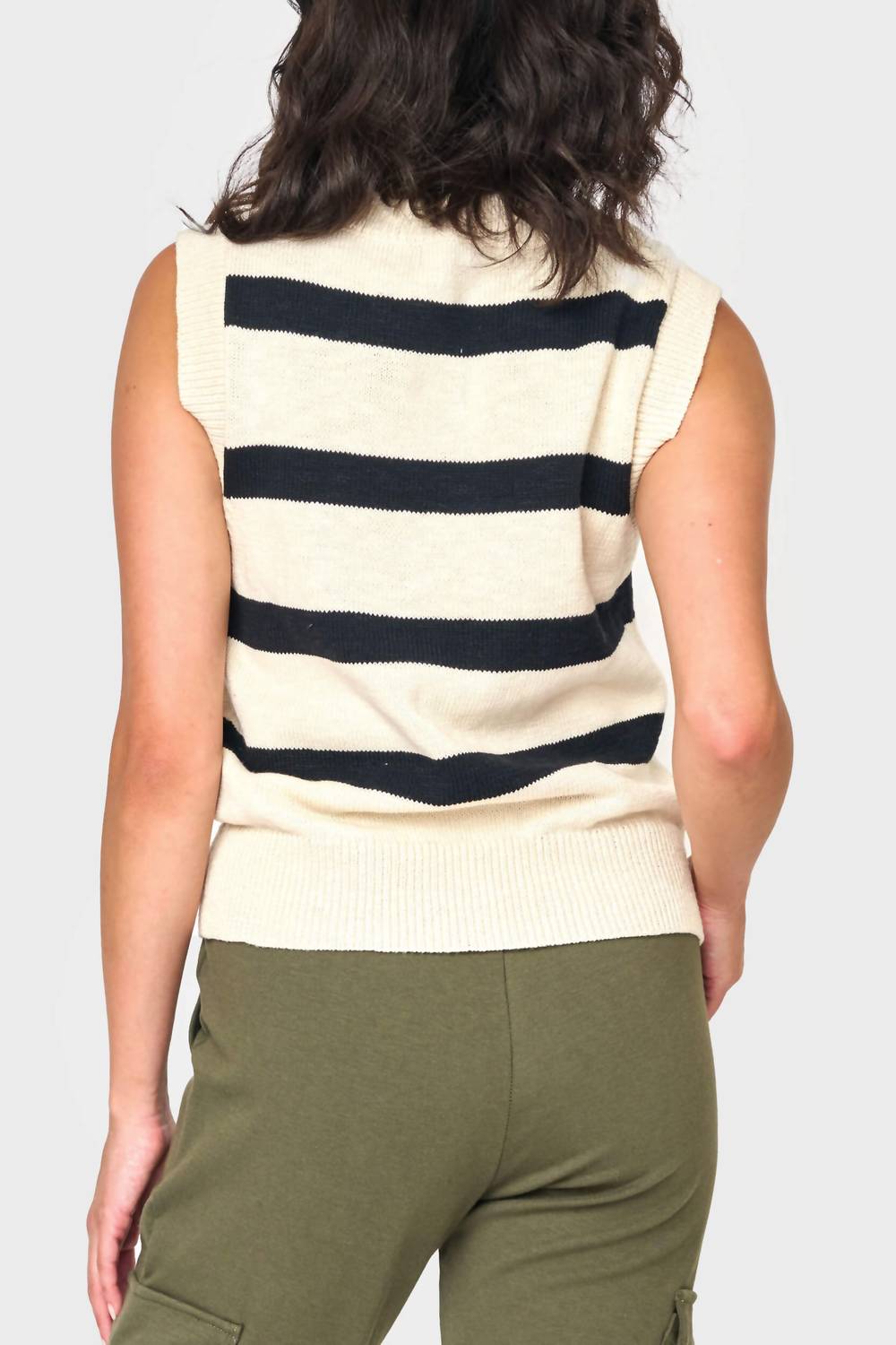 A timeless blouse that will never go out of style. Introducing the Sanctuary Sweater Shell in Eco Natural Black Stripe, perfect for a relaxed yet sophisticated look. This sleeveless tank features a V-neckline and ribbed hems, crafted from 100% cotton for ultimate comfort. It measures 21 1/2" in length for a size small, allowing for versatile styling. Closure: Pull on. Care instructions: Machine wash on a delicate cycle, lay flat to dry.