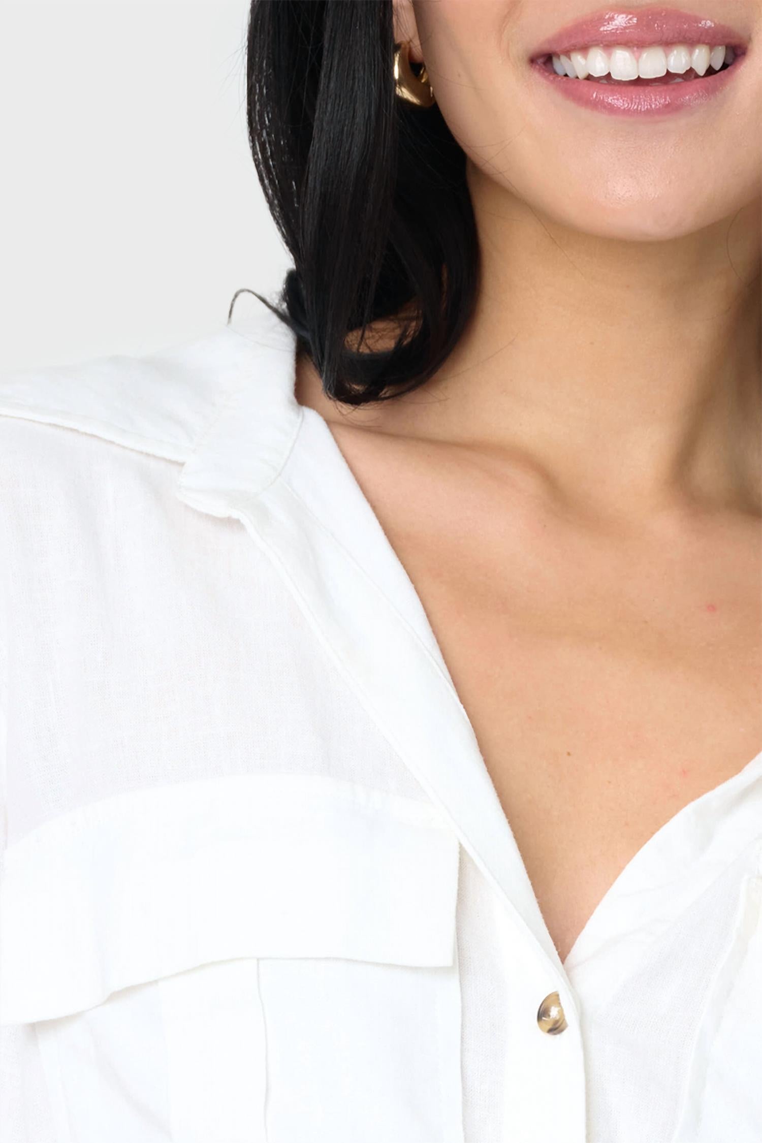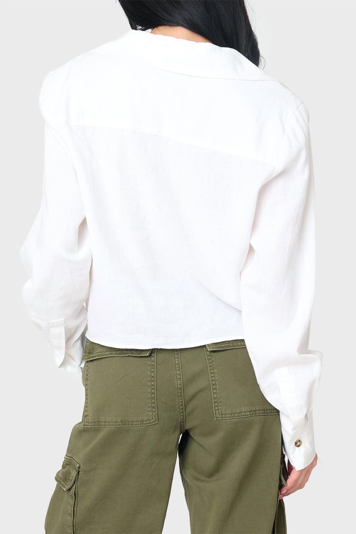 A versatile blouse that works from desk to dinner! Meet the Sanctuary Utility Pocket Shirt, a chic addition to any wardrobe with its classic point collar and long sleeves. Crafted from a 54% linen and 46% viscose blend, this blouse boasts a button closure for a timeless look. Measuring 23 inches in length for size small, the shirt is designed with handy chest pockets and a stylish tie front feature. Easy to care for with a simple machine wash.
