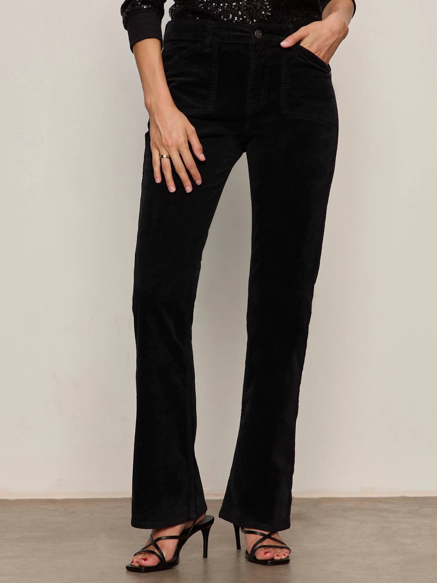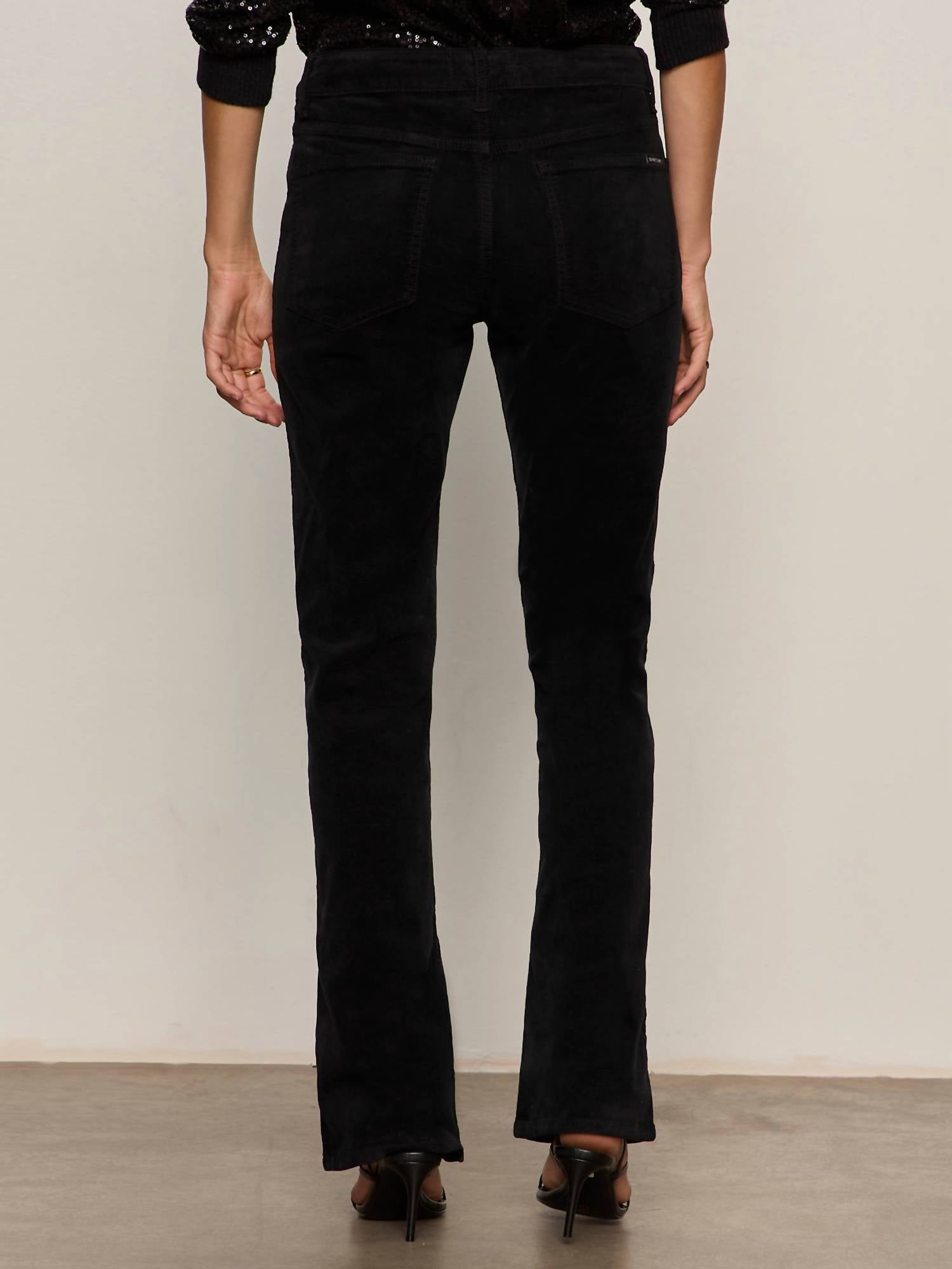 If you're looking for boot-cut, this is the jean for you. Discover the Velveteen Brook Bootcut Jeans by Sanctuary, a perfect blend of comfort and style in a versatile black shade. These bootcut pants, crafted from 98% cotton and 2% spandex, feature a standard rise and a zipper front closure. Designed with a flattering 10.5-inch rise and a 33.5-inch inseam, these jeans are ideal for elongating your silhouette while remaining impeccably fitted. Complete with two front and two back pockets, these jeans are machine washable and can be tumble dried on low, ideal for everyday ease. Model is 5'9" and wears a size 27.
