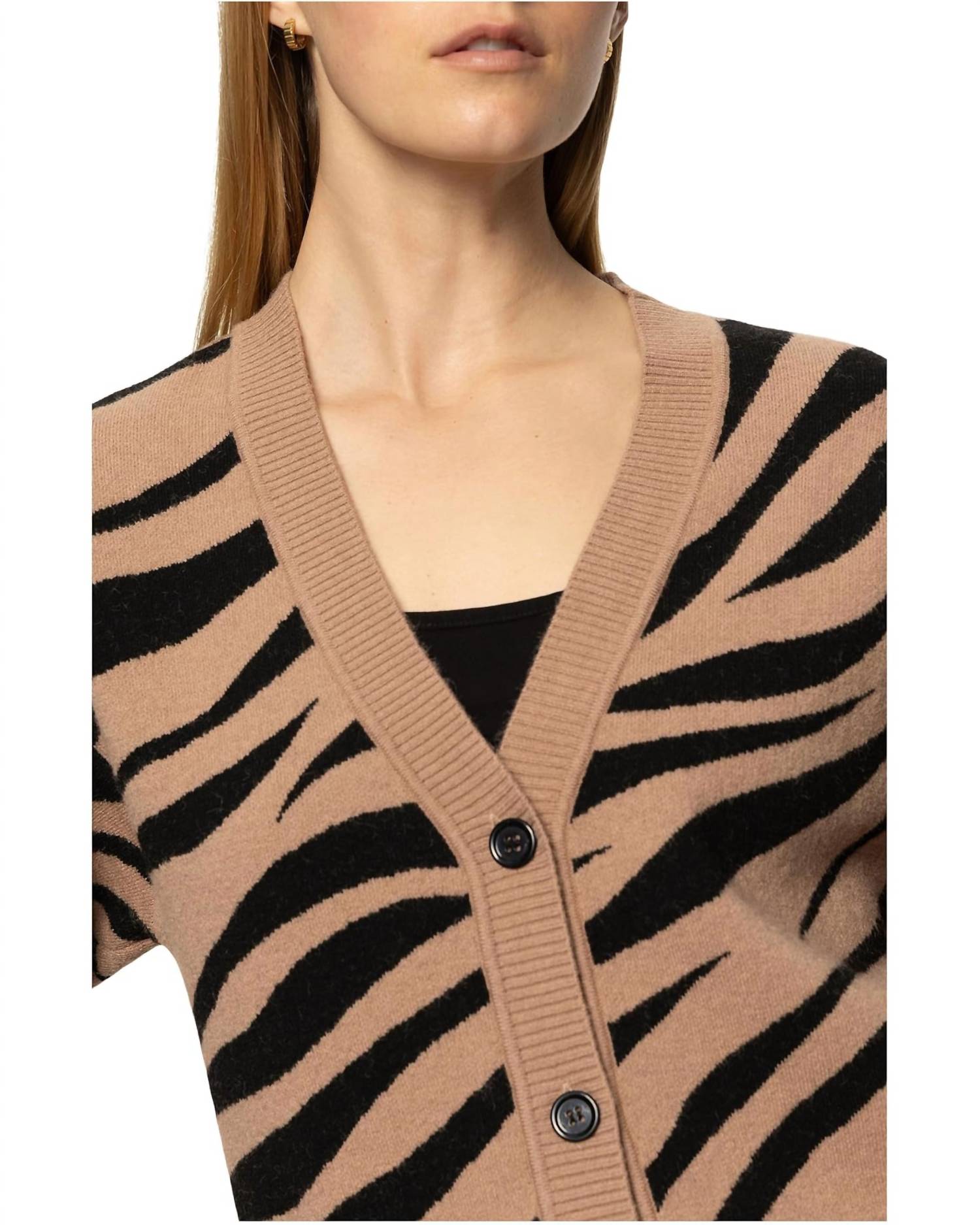 Throw this adorable cardigan over any cami or tank top. Introducing the Zebra Knit Cardi by Sanctuary, a chic statement piece perfect for fall adventures and New Year's Eve celebrations. This women's cardigan features a bold abstract zebra pattern with long sleeves and a stylish V-neck. Made from a blend of 74% polyester, 15% acrylic, and 11% polyamide, it offers comfort and style without pockets.