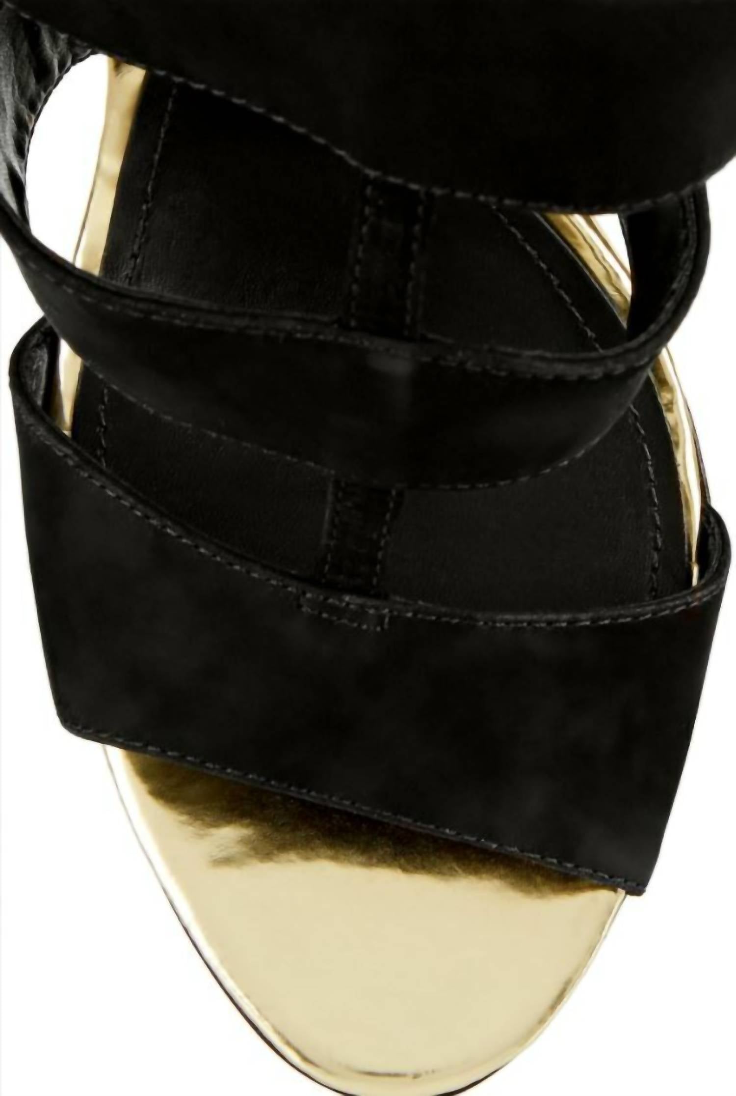 This sandal will take you from brunch to dinner and everything in between. Step into elegance with the Women's Shine Wedge Suede Heels by SCHUTZ, crafted to make a statement. These sandals feature a dazzling 4" gold metallic mirror wedge heel, perfectly complemented by a black suede leather strappy upper. Originating from Brazil, they boast an ankle strap and buckle closure for a secure fit. The high-quality leather upper is paired with a leather and synthetic lining, and a leather sole, ensuring durability and style.