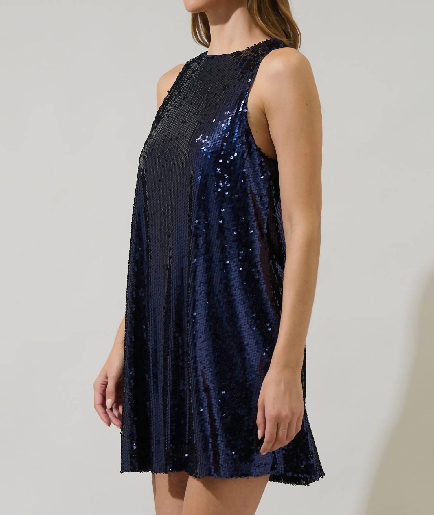 The kind of easy and flattering dress you'll be reaching for all season long. Step into elegance with the Liviana Sleeveless Sequin Dress by SUGARLIPS, a stunning choice for your next evening event. Designed in a shift silhouette, this navy mini dress features a crewneck, sleeveless design, and eye-catching sequin texture. Made of 100% polyester, it ensures a comfortable fit with a zip closure at the back. Care for this piece by machine washing; it's the perfect addition to embrace the quiet luxury trend this spring. Model is 5'9" and wearing size XS, with a chest measurement of 18 3/4" and a length of 33 1/2".
