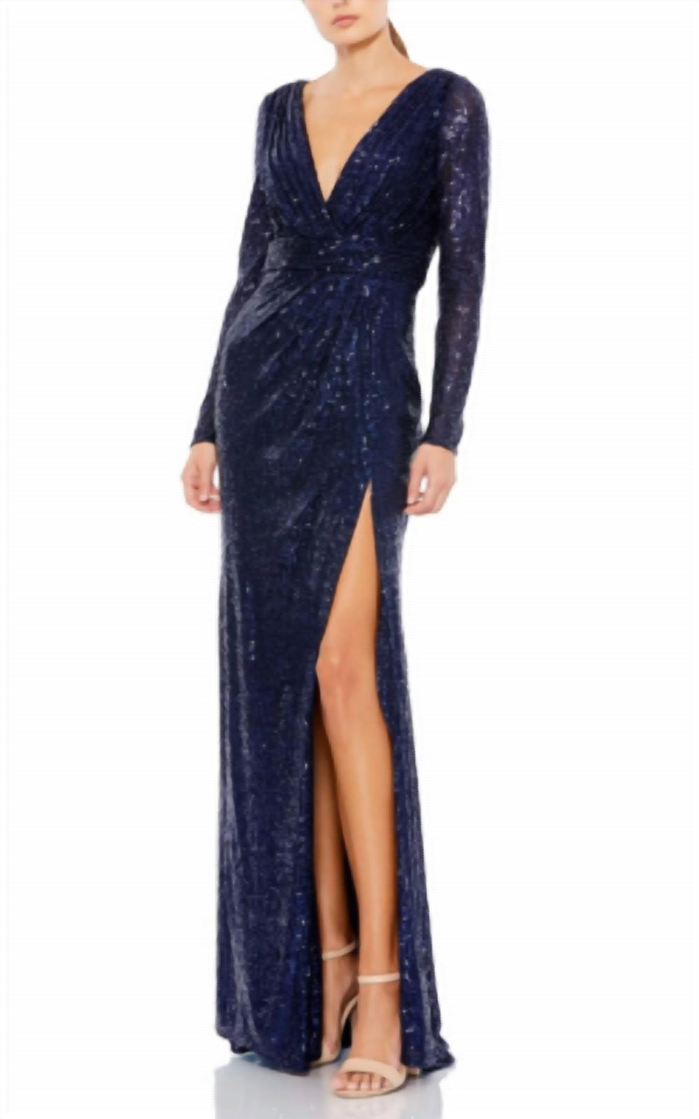 Mac Duggal - Sequin Long Sleeve Gown With Plunging Neckline