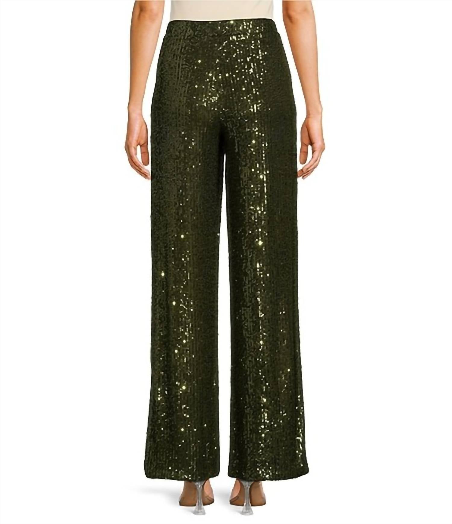 Elevate your evening look with the Sequins Semi Flared Pants by SKIES ARE BLUE, expertly crafted for the fall season. These olive wide-leg pants feature a pull-on closure and a semi-flare silhouette, providing a chic yet comfortable fit. Made from a textured blend of polyester and spandex, they boast a glamorous sequin fabrication. With an approximate inseam of 29.75", full length of 41.75", and a leg opening of 11 3/8", these pants are perfect for a dinner party where making a statement is key. Care: Hand wash recommended.