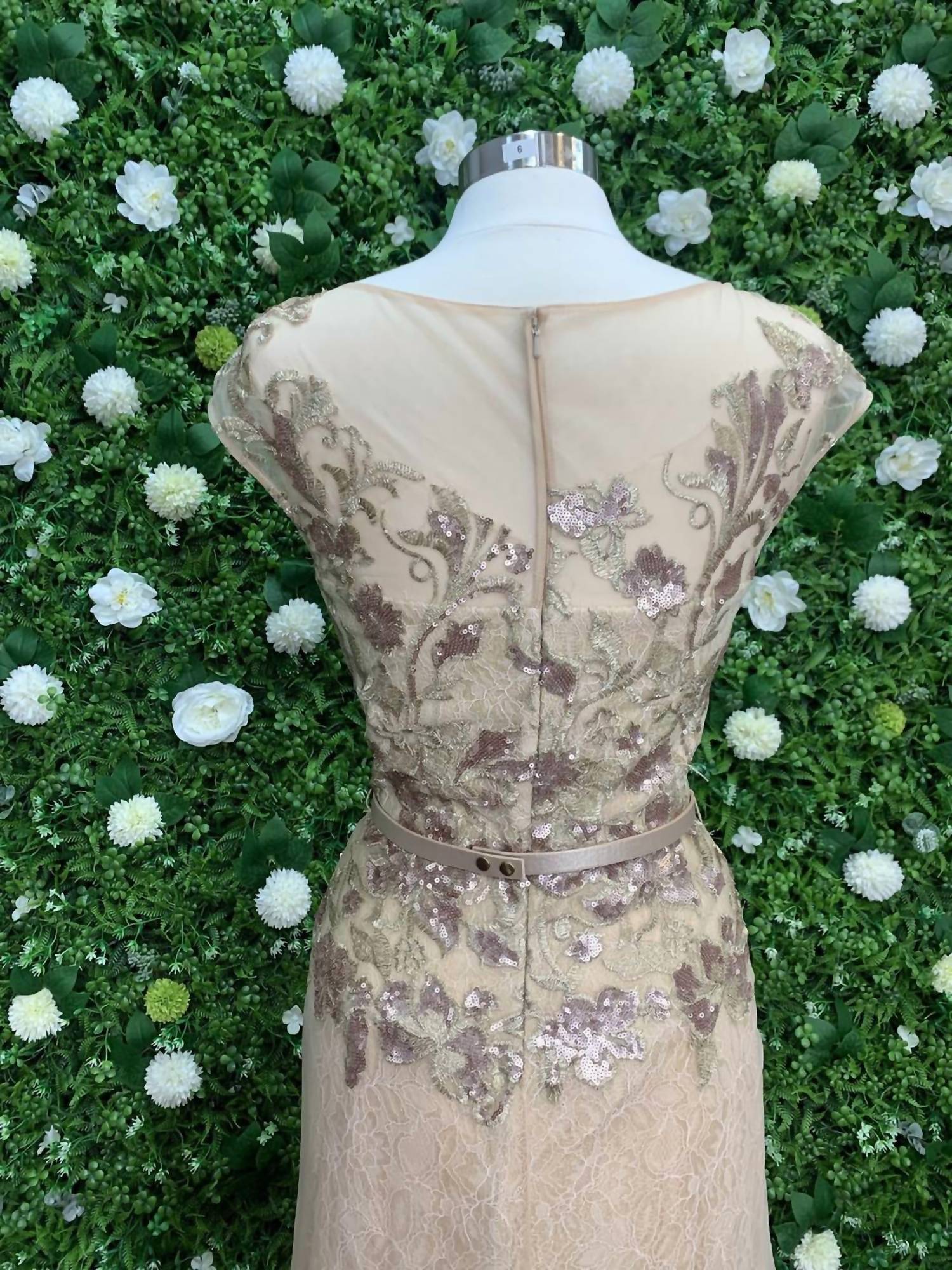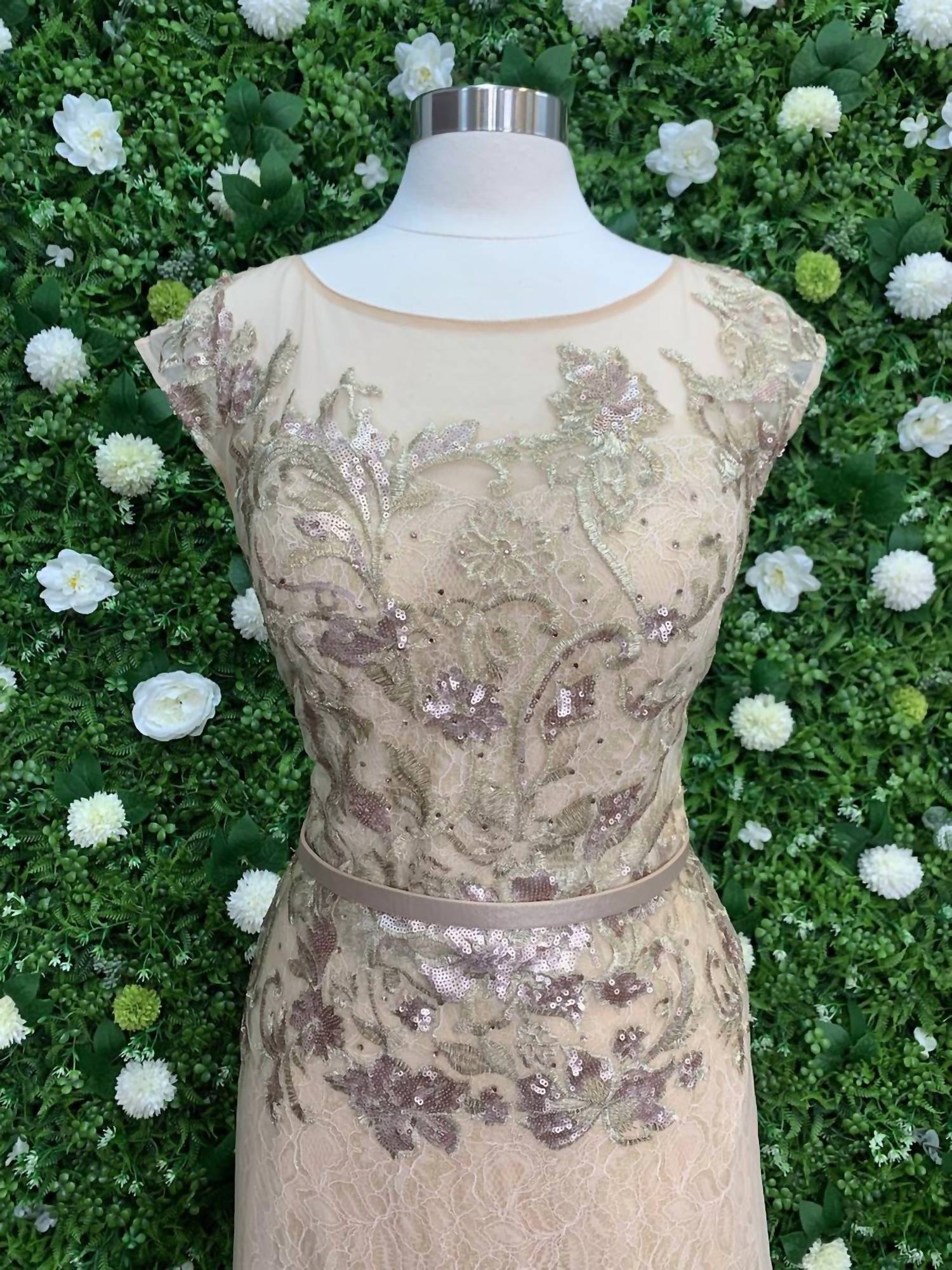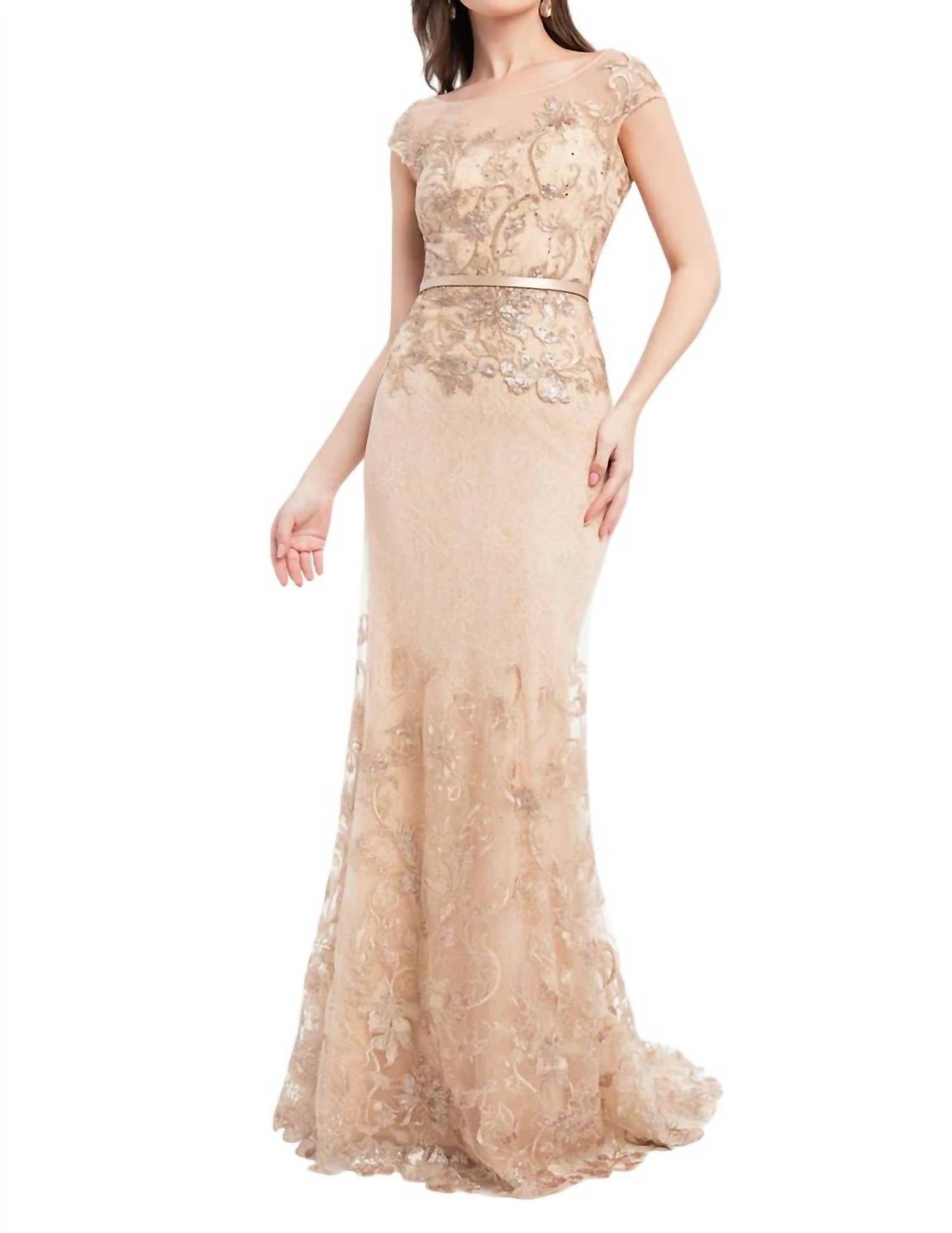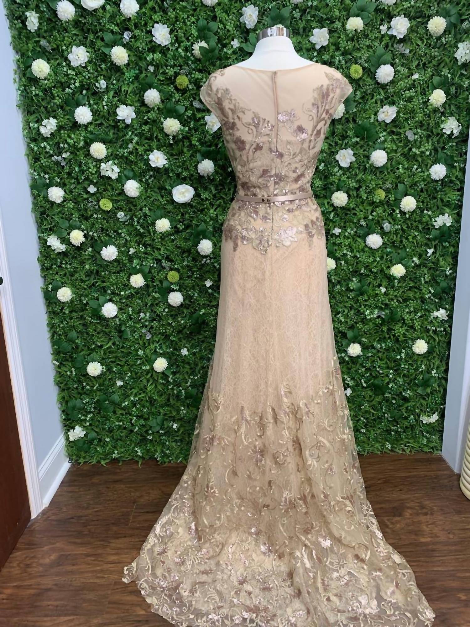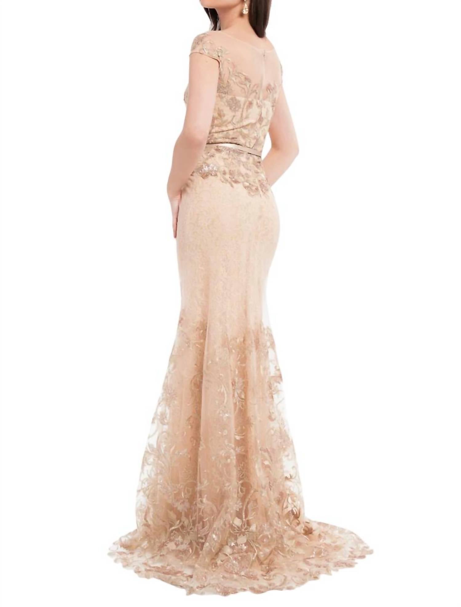 Just add a cute little clutch and a matching heel for the perfect event look. Introducing the Sequined Metallic Lace Trumpet Gown by Terani Couture, an exquisite piece in Rose Gold/Nude perfect for any evening event. This gown features cap sleeves, a long trumpet silhouette, and an illusion bateau neckline, all enhanced by sheer fabric and intricate metallic lace detailing. Made from 100% polyester, it has a zip closure for a secure fit. Ideal for a stylish New Year's Eve occasion, this piece captures a vintage trend with sequins and a sweep train that creates a dramatic finish.