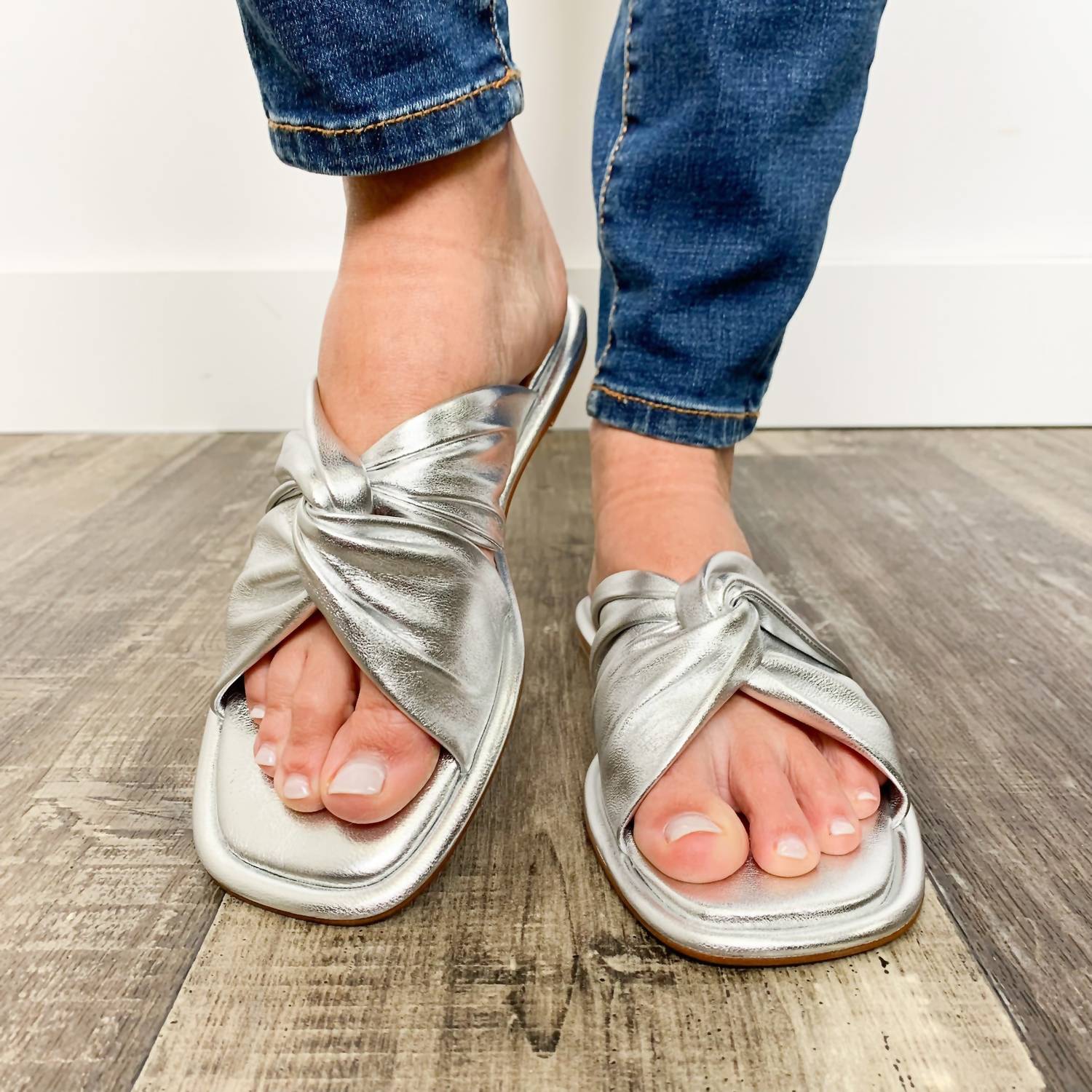 Flowy dresses, cropped pants, and even jumpsuits... this sandal works with them all! Step into style with the Women's Yaya Sandals by J/SLIDES, crafted in a stunning silver color. These sandals feature supple leather uppers, leather lining, and a durable rubber sole paired with an open-toe design and a flat heel for comfortable wear. The lightly cushioned footbed ensures all-day comfort, ideal for any occasion. Perfectly versatile, these sandals bring a touch of elegance to any outfit.