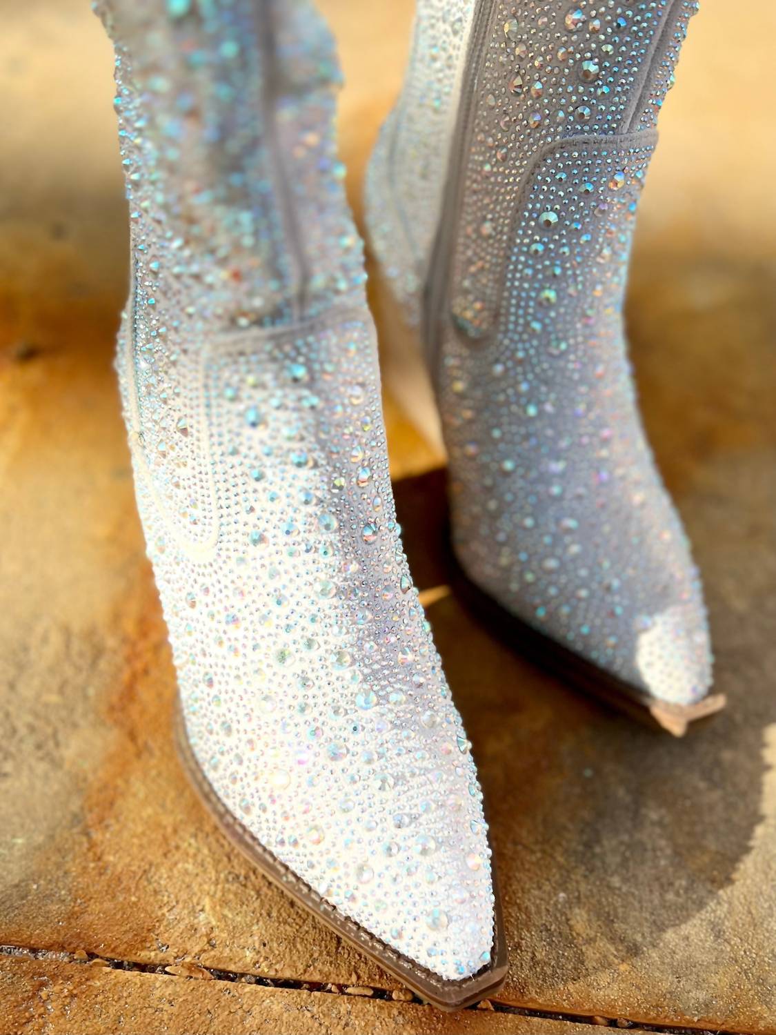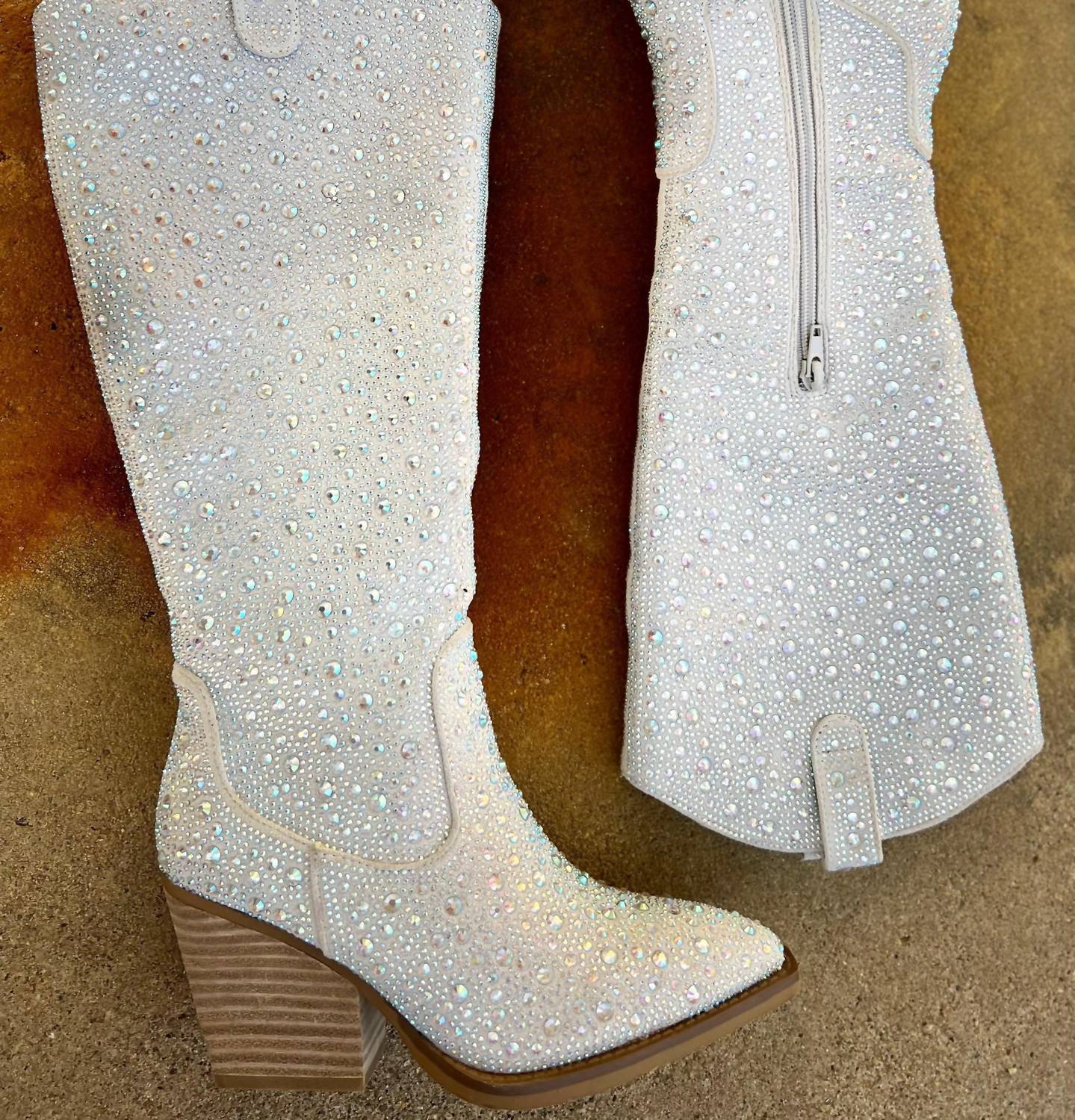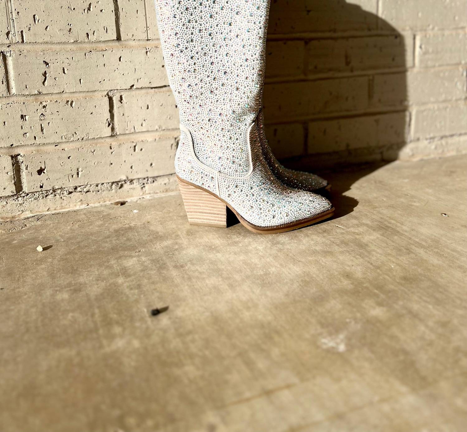 A trend that is here to stay. Step up your style with the Women's Tall Cadillac Boots by Very G, perfect for adding glamour to any party look. These over-the-knee boots feature striking all-over iridescent rhinestone detailing and a sleek pointed toe silhouette. Designed with a convenient side inside ankle zipper closure, they boast a 3" wooden block heel and a total height of 18" from sole to top. Elevate your ensemble with these captivating silver boots.