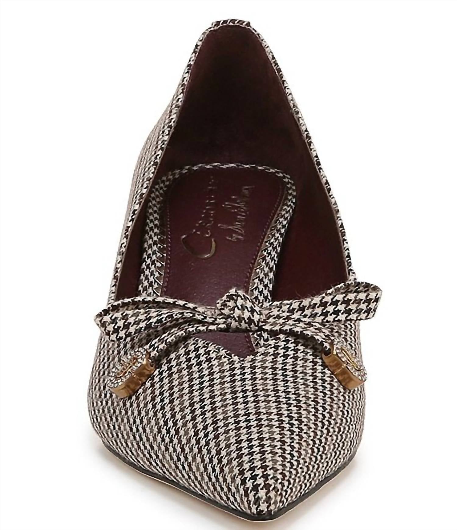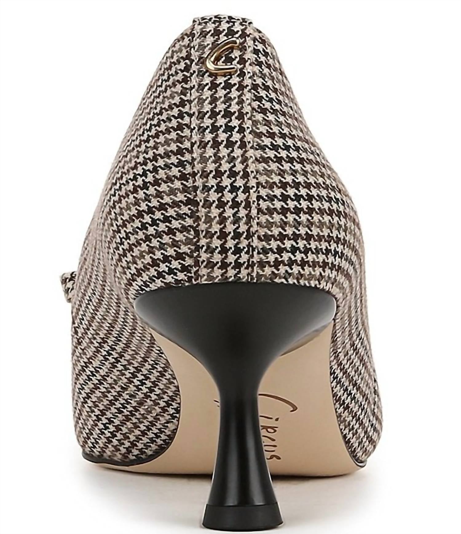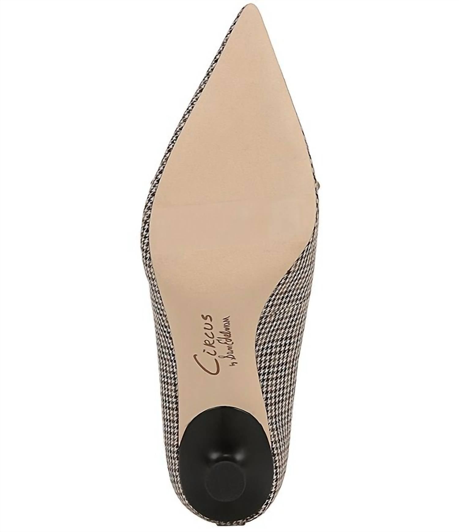 Slip into elegance with the Women's Fleur Houndstooth Kitten Heel Dress Pumps from Circus by Sam Edelman. These stylish pumps feature a sophisticated houndstooth fabric upper, accentuated by charming bow details with a decorative charm. With a sleek 2.375" kitten heel, they offer the perfect lift for an elegant silhouette, while the slip-on construction ensures effortless wear. The synthetic lining and sturdy rubber outsole promise comfort and durability for every step. Ideal for any fashion-forward wardrobe in a versatile Black Natural Multi colorway.