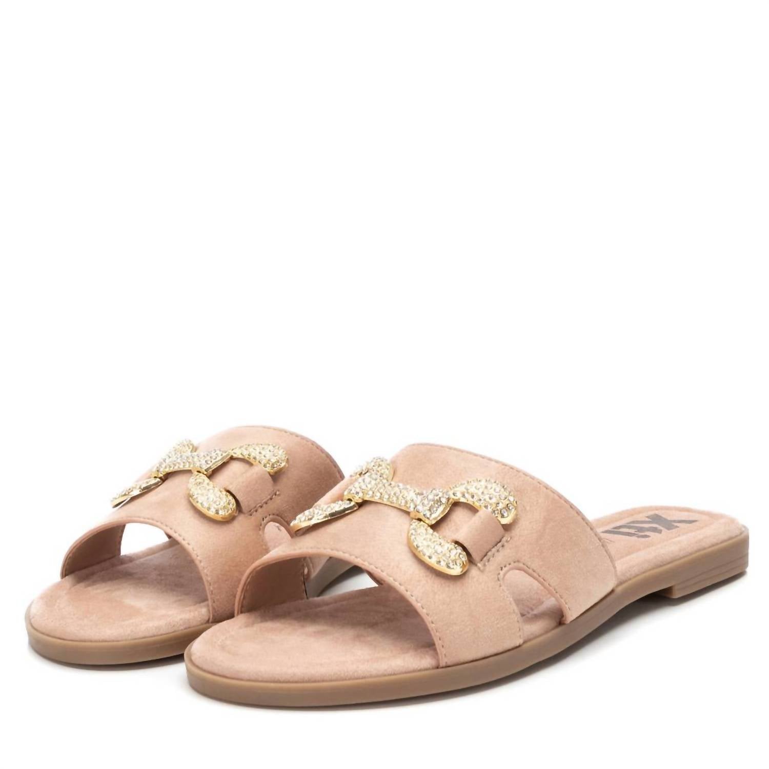 Classicly cute and all-day-wearable. We love this sandal. Step confidently in the Women's Flat Sandals by Xti, showcasing a chic beige hue and trendy shovel design with metallic detail. Crafted from high-quality nylon, these sandals feature a round toe and non-slip rubber sole for maximum comfort and safety. Enjoy the benefits of the Comfortech insole paired with a lightweight, anti-slip outsole, making these vegan-certified sandals by PETA your go-to choice for fashion and comfort. They are designed with a flat heel, perfect for any occasion, whether it's a day at the beach or an evening outing.