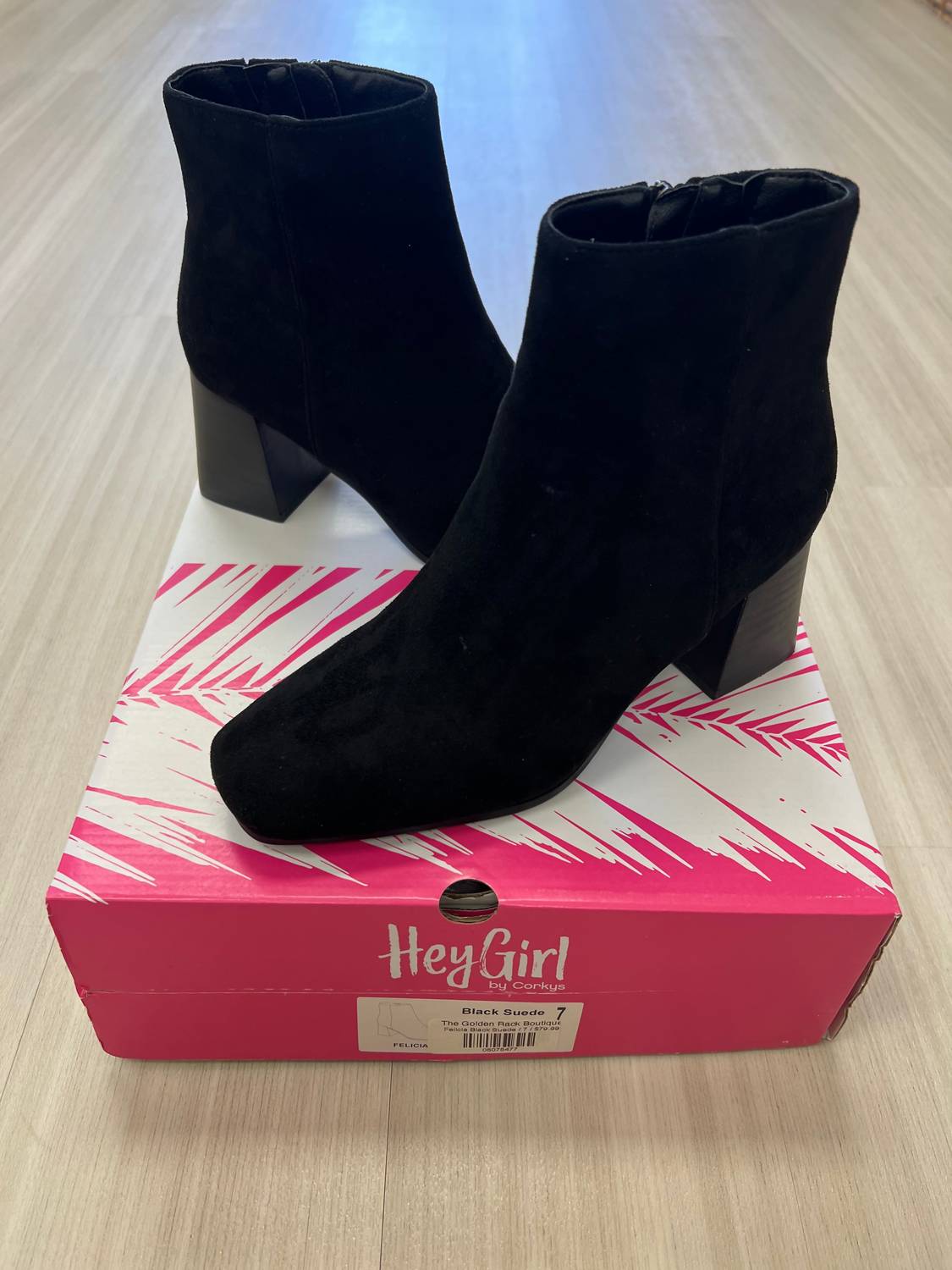 Introducing the Women's Felicia Suede Boot by Corkys Footwear, your go-to for stylish yet comfortable evening occasions. This black bootie features a synthetic upper in faux suede with a chic square toe and a convenient side zip closure. Its 2 1/2" block heel ensures just the right elevation, making it perfect for fall streetwear looks or holiday gatherings. Experience true-to-size comfort, but consider sizing up if you're between sizes.