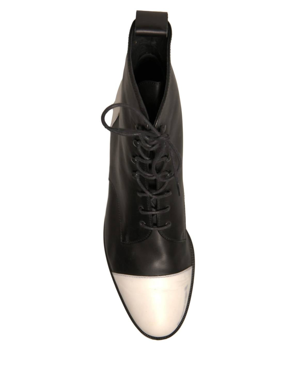 Upgrade your shoe game with these stylish lace-up boots, designed to merge sophistication and comfort. You'll be reaching for these shoes season after season. Step up your style game with the Women's Leather Lace Up Flats Ankle Boots by Sergio Rossi, perfect for a sophisticated dinner party in spring. These black and white ankle boots are made with premium leather material and offer a lace-up closure for a secure fit. Originally crafted in Italy, they feature a chic pointed toe and flat heel style. Please note the minor discolorations on both shoes, visible in the images.