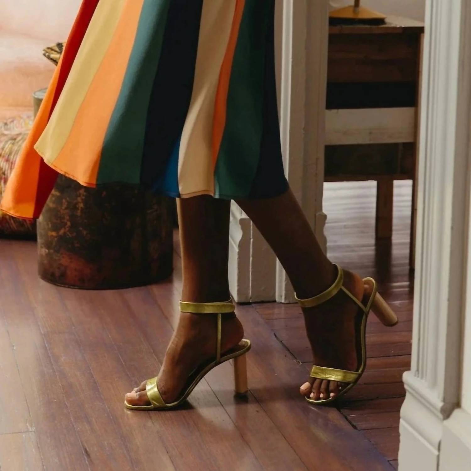 This sandal will take you from brunch to dinner and everything in between. Introducing the Gina Strappy Heel Sandal by COCLICO, a sophisticated shoe in striking chartreuse perfect for a dinner party or New Year's Eve. Made from Italian, certified sustainable patinated leather, this sandal features a sleek, straight, narrow front strap and an ankle strap secured with velcro, combining both style and comfort. With a 2.75-inch block heel sculpted from solid Ash wood and reinforced with internal steel, it offers stability and reduces fatigue without compromising on elegance. Made in Spain, this heel embodies the trend of quiet luxury, ideal for your spring wardrobe.