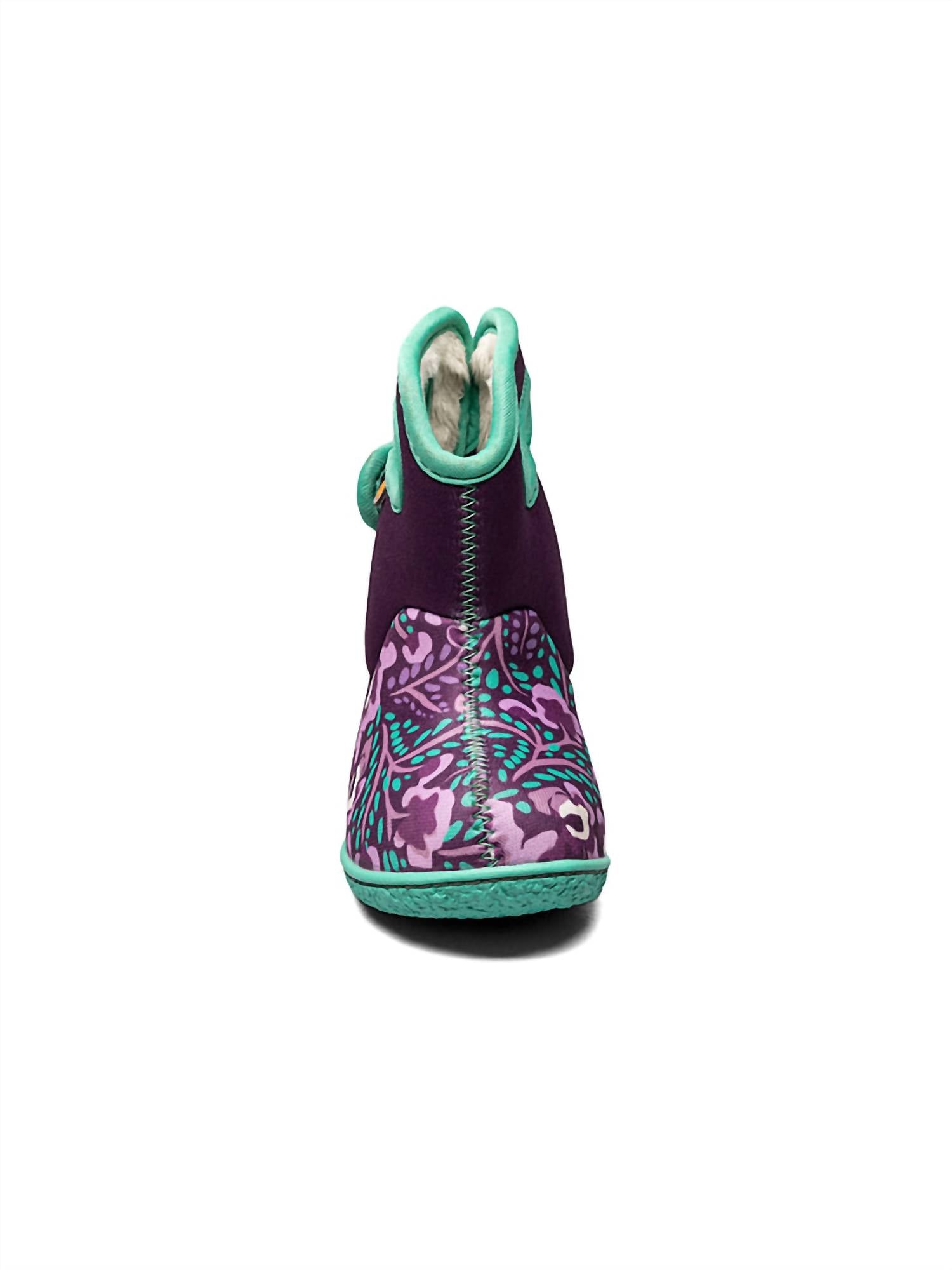 Meet the Baby/Toddler Classic Flower Power Bootie by BOGS, a stylish and functional choice in vibrant purple for your little one's fall adventures. Designed with a round toe shape, these boots offer 100% waterproof construction and feature 3mm Neo-Tech waterproof insulation to keep small feet warm and dry. Benefit from BOGS Max-Wick technology to evaporate sweat and DuraFresh natural bio-technology to minimize odors, all while enjoying a plush lining for comfort. With a comfort rating of 14°F/-10°C and the convenience of being machine washable, these booties effortlessly blend style with practicality for your toddler's travel and outdoor escapades.