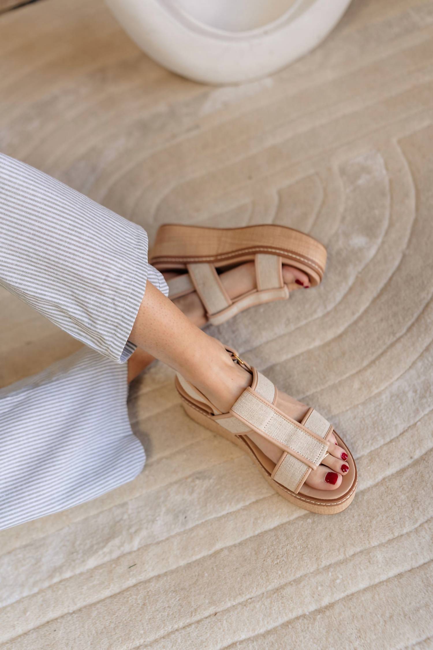 Elevate your footwear game with these adorable wedges. Step into effortless style with the Swell Platform Wedge Sandal by Chinese Laundry, crafted in beige for a touch of natural elegance. Featuring a faux leather and fabric upper with a breezy raffia wedge/platform, this sandal offers a comfortable 2.5" wedge height and 1.75" platform lift, perfect for summer outings. The open toe design and adjustable Velcro strap ensure a secure fit, while the medium width accommodates all-day comfort. Ideal for vacation or any boho chic event, these sandals are the perfect blend of laid-back sophistication and modern fashion.