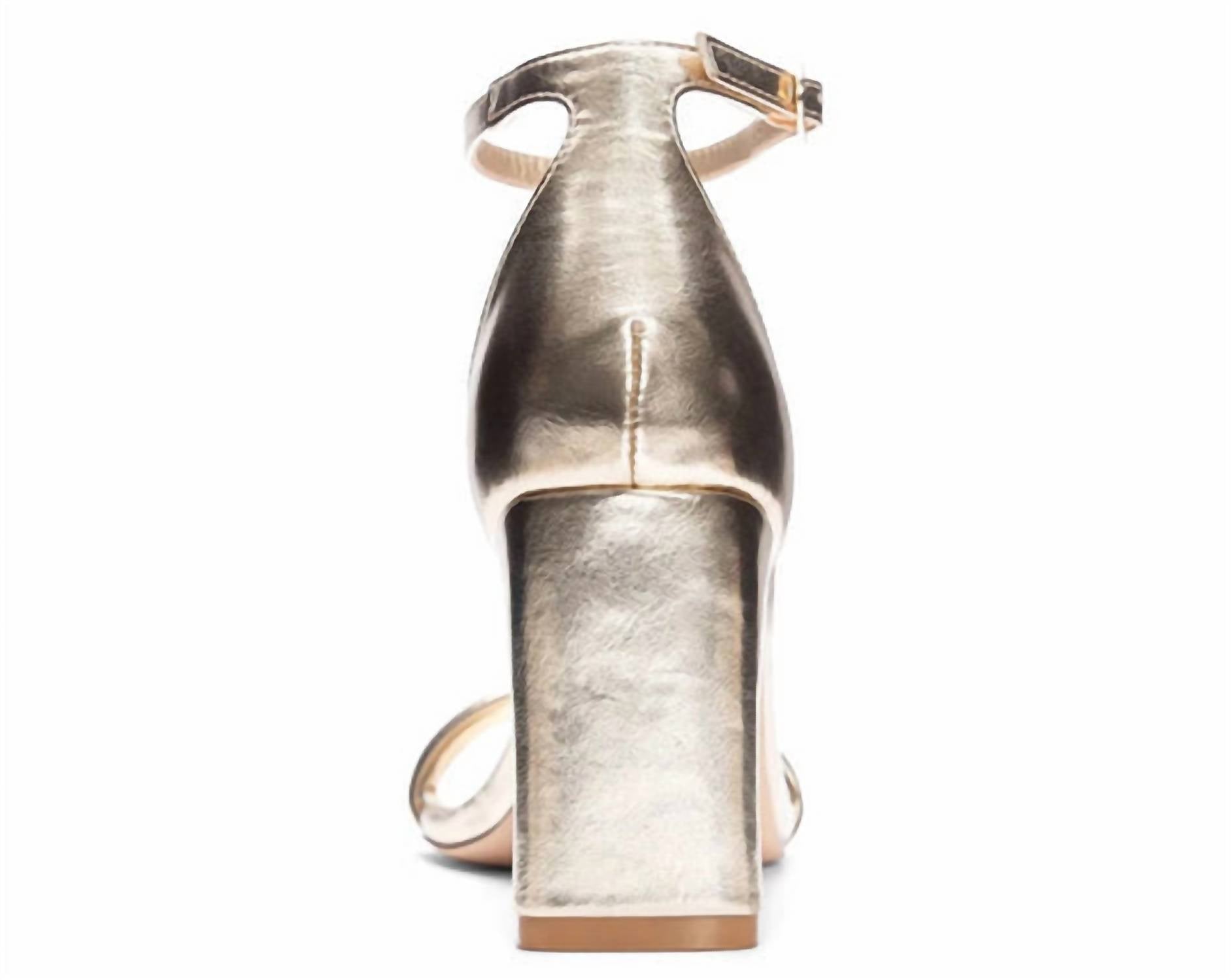 Don't be deceived, these heels are comfy as can be. Introducing the Women's Velma Metallic Heel by Chinese Laundry, designed to add grace and charm to your evening attire. These gold block heel sandals feature a synthetic upper, lining, and outsole with a sophisticated square toe. Enjoy a secure fit with the adjustable buckle closure at the ankle and a cushioned insole for added comfort. Imported and crafted with a heel height of 3.25 inches, this pair effortlessly combines style and practicality for any spring evening event.