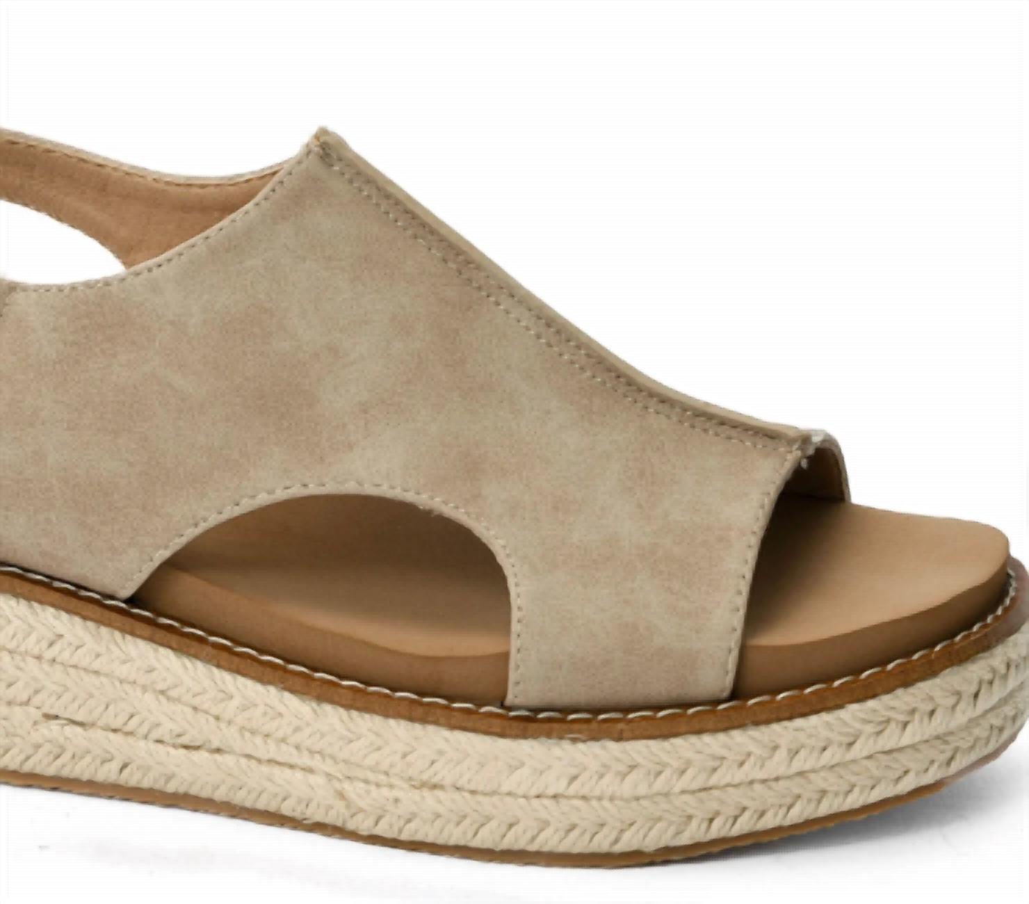 Dresses, denim, shorts... these wedges go with just about anything. Introducing the Ready Or Not Sandal by Corkys Footwear in sophisticated taupe, perfect for spring occasions. These women's wedges feature a comfortable open toe and a stable 2-inch wedge heel for reliable all-day support. The EVA insoles provide enhanced cushioning, while the hook and loop closure offers a secure, adjustable fit. Finished with a stylish jute-wrapped bottom, they're a blend of comfort and casual elegance.