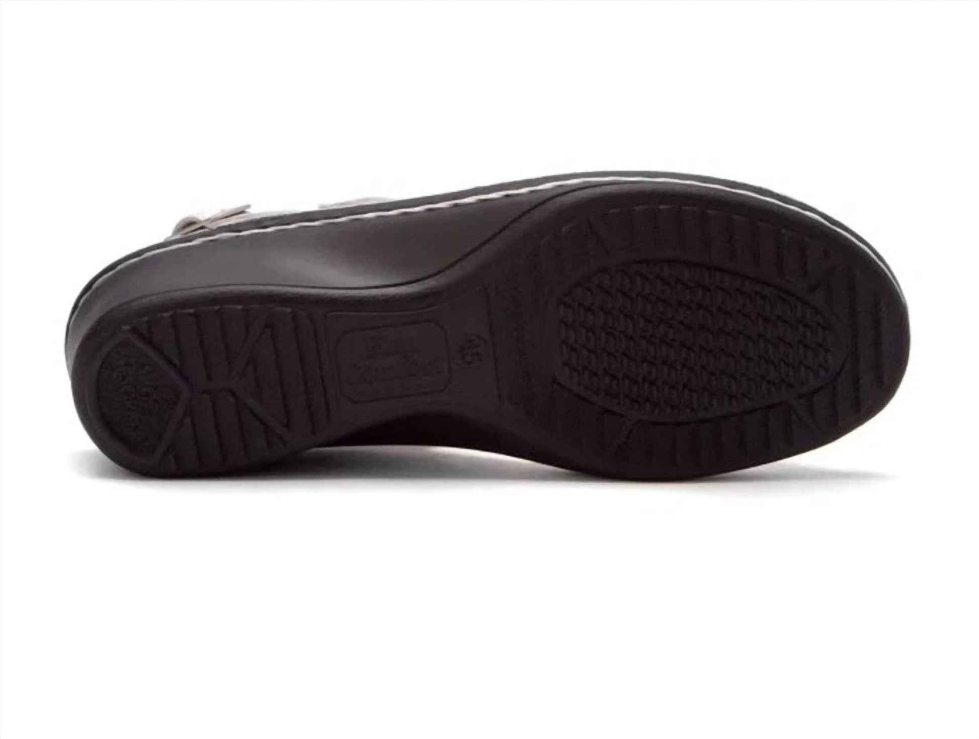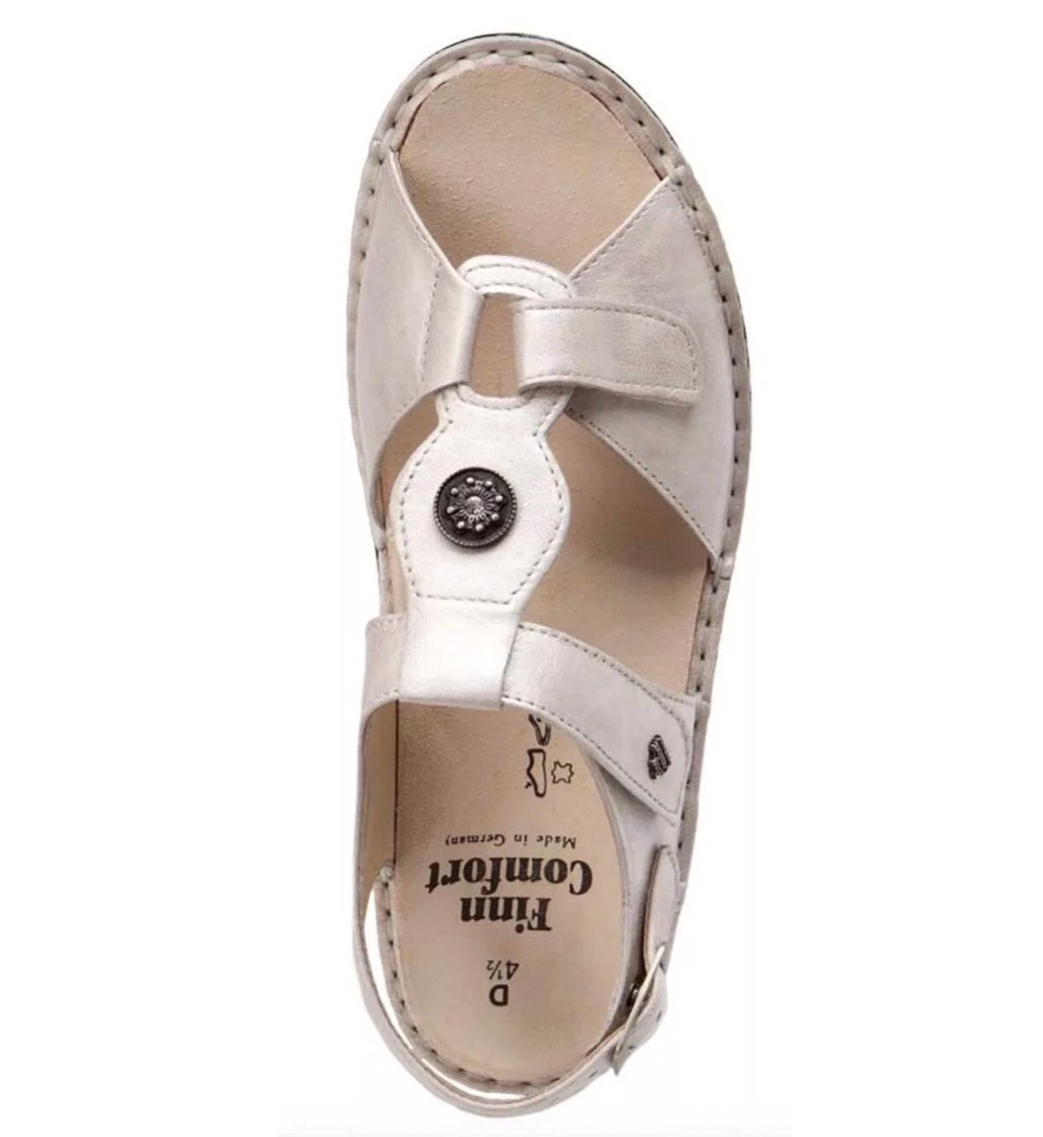 Dresses, denim, shorts... these wedges go with just about anything. Step into unparalleled comfort with Finn Comfort's Women's Adana Sandals in a sleek silver hue. Made from 100% leather, these wedges feature a thoughtfully designed open toe and a heel height of approximately 1.5 inches. The smart design includes a platform of about 0.5 inches as well as Velcro strap and snap closures for a customizable fit. The shoe's interior combines natural suede and leather for an elegant finish, complemented by two sets of removable orthopedic footbeds to ensure every step feels just right.