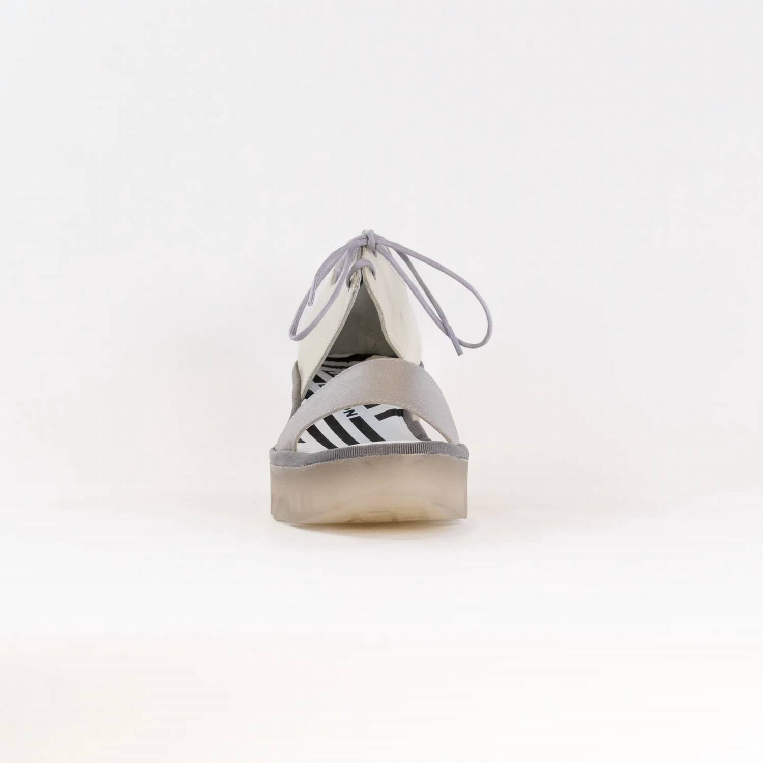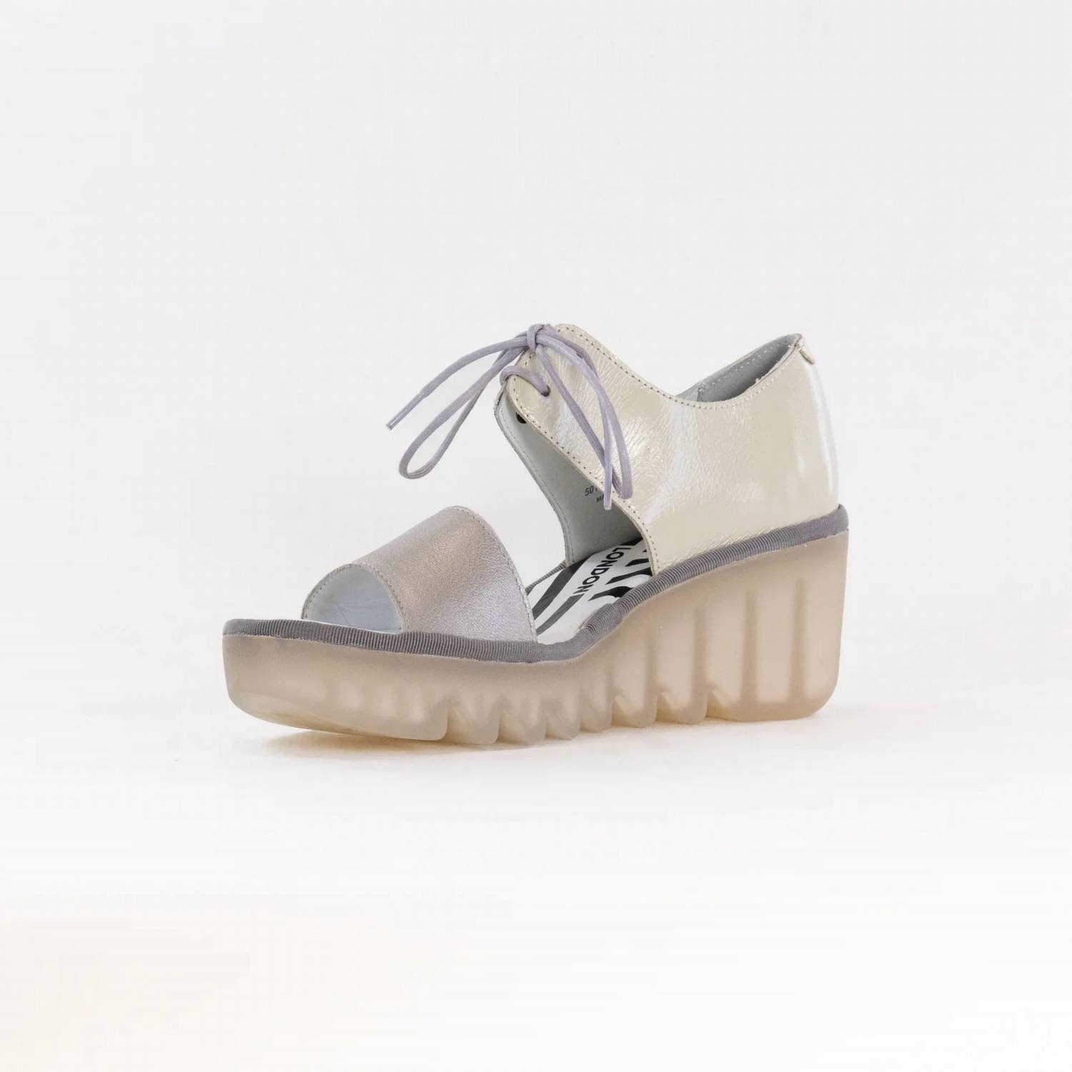 Timeless wedges that will be relevant season after season. Step out in style with the FLY LONDON Women's Lace-up Wedge Sandal in silver/off white, perfect for a minimalist spring look. Crafted in Portugal, these sandals feature an open toe and a comfortable wedge heel style, each with a heel height of 3 inches and a 1-inch platform. Made with a leather upper, lining, and footbed, plus a durable rubber outsole, they ensure luxury and comfort. The adjustable lace closure allows for a personalized fit, making them ideal for any evening event.