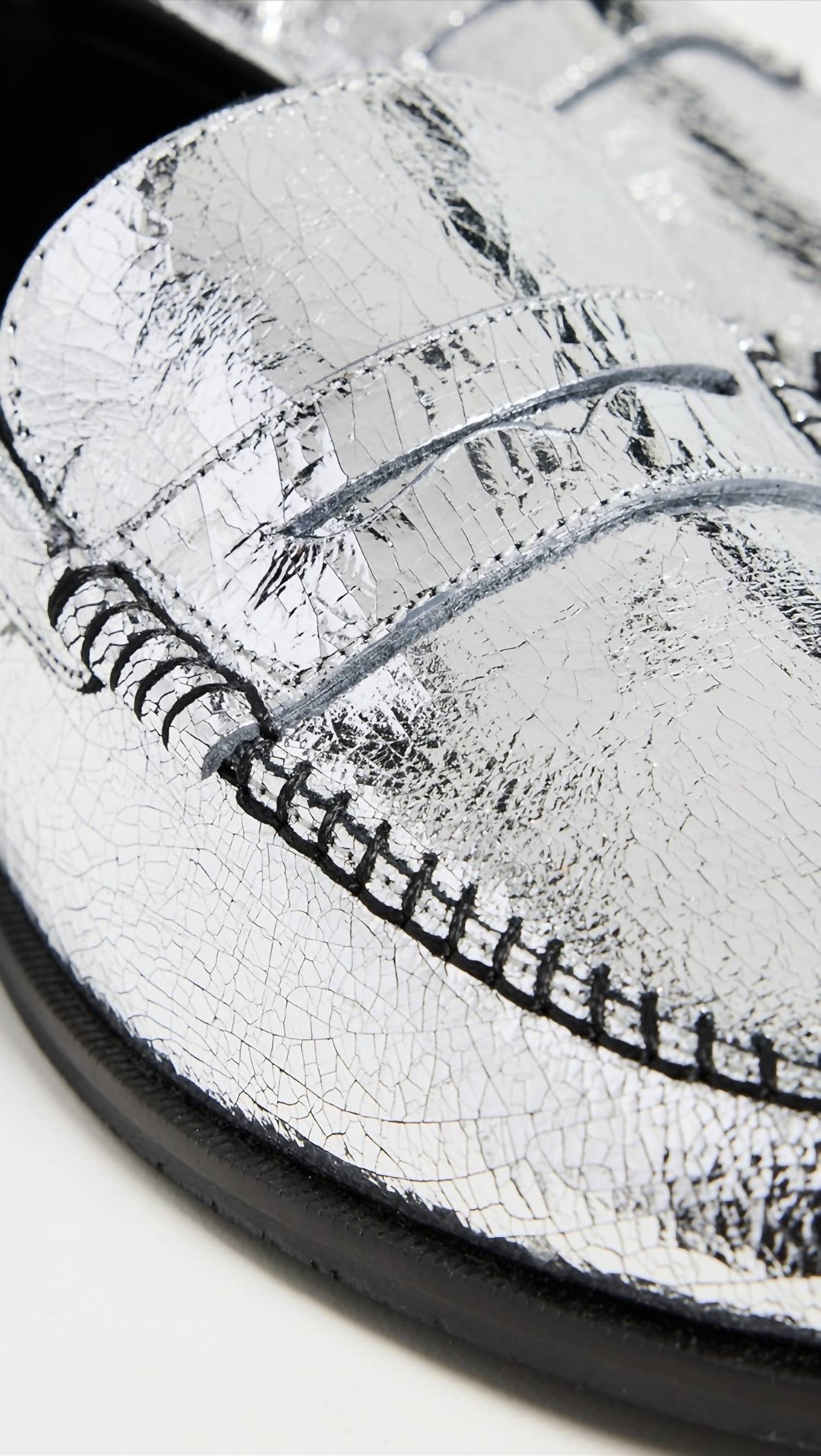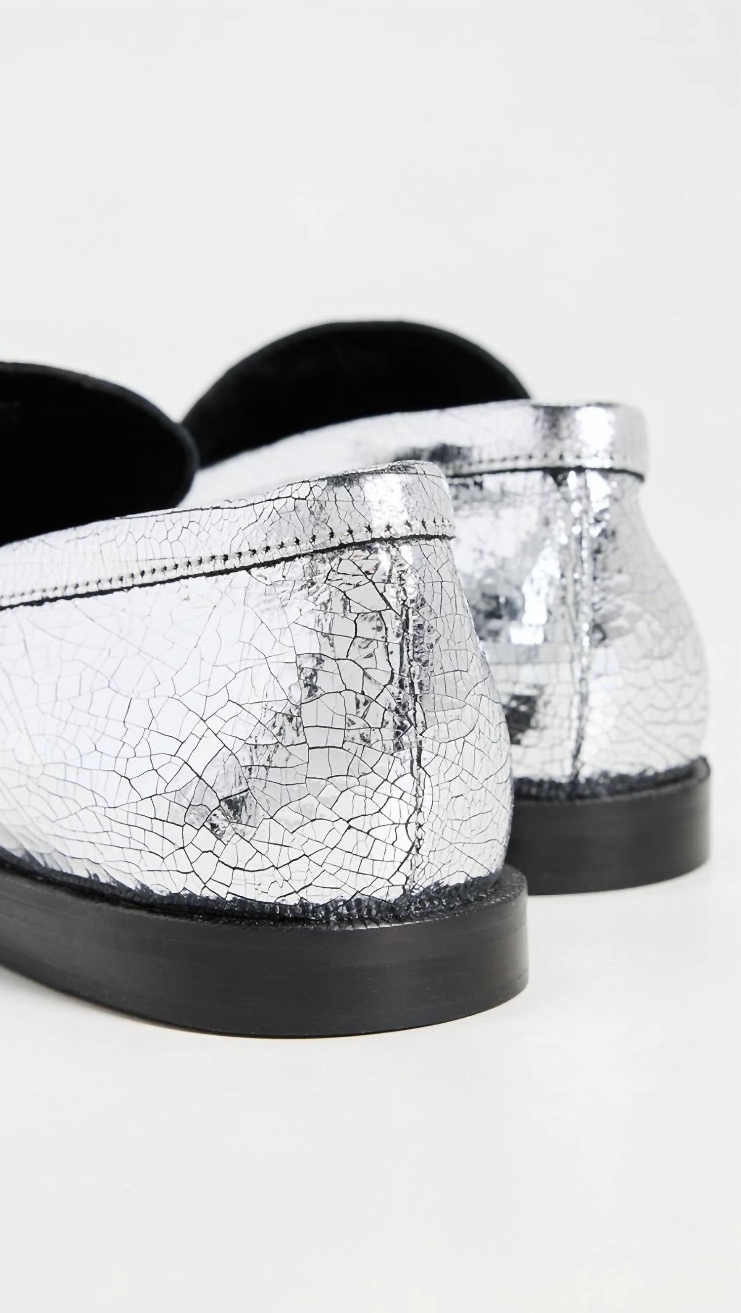 Loafers so versatile you can wear them with just about anything. Step into modern elegance with the Women's Blanket Stitch Loafer by Free People, crafted in crackled pale pewter leather. With a convenient slip-on style, these stunning loafers feature round apron toes, contrast blanket-style stitching, and a charming penny vamp strap detail. Both the upper and lining are made from high-quality leather, while a flat rubber sole ensures durability and comfort. Expertly crafted in India, these loafers effortlessly combine style with practicality.