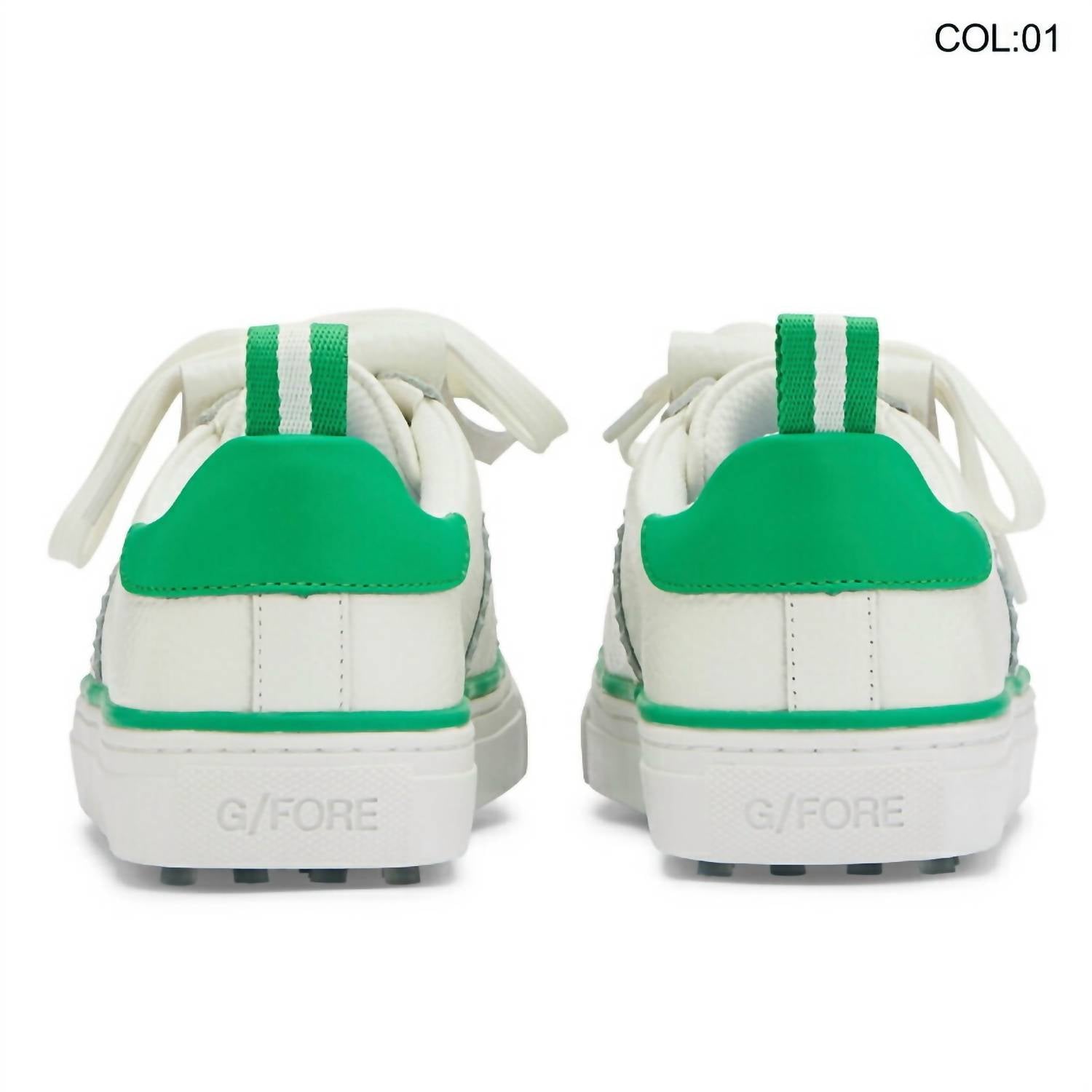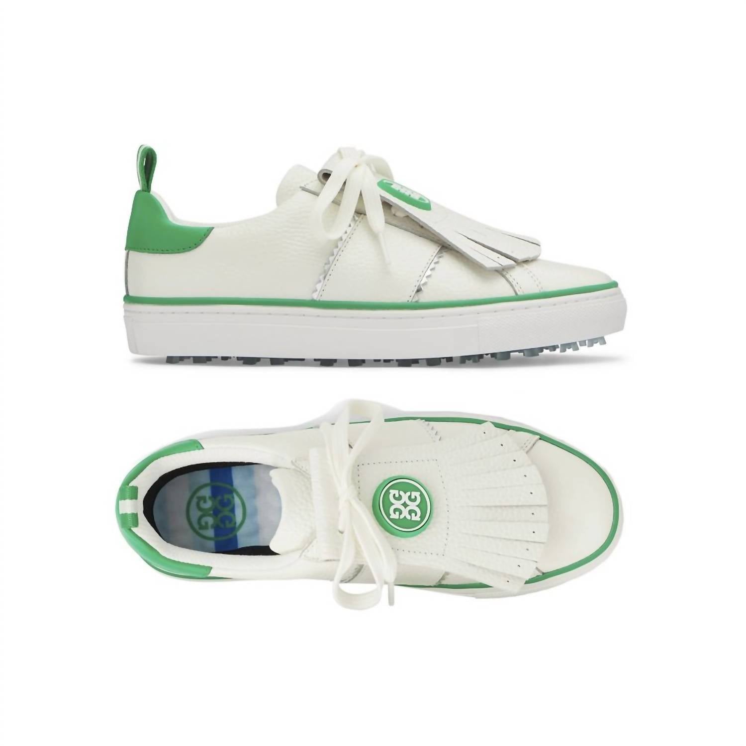 Workout in style with these adorable athletic sneakers. Step into style and comfort with the Women's Kiltie Disruptor Shoe by G/Fore in an eye-catching White Green colorway. These athletic shoes are designed with a round toe and flat heel, ideal for fitness and workout sessions. Embrace the athleisure trend with a springtime flair, perfect for any adult woman looking to blend fashion with functionality. Made with precision, these shoes are a must-have addition to your active wardrobe.
