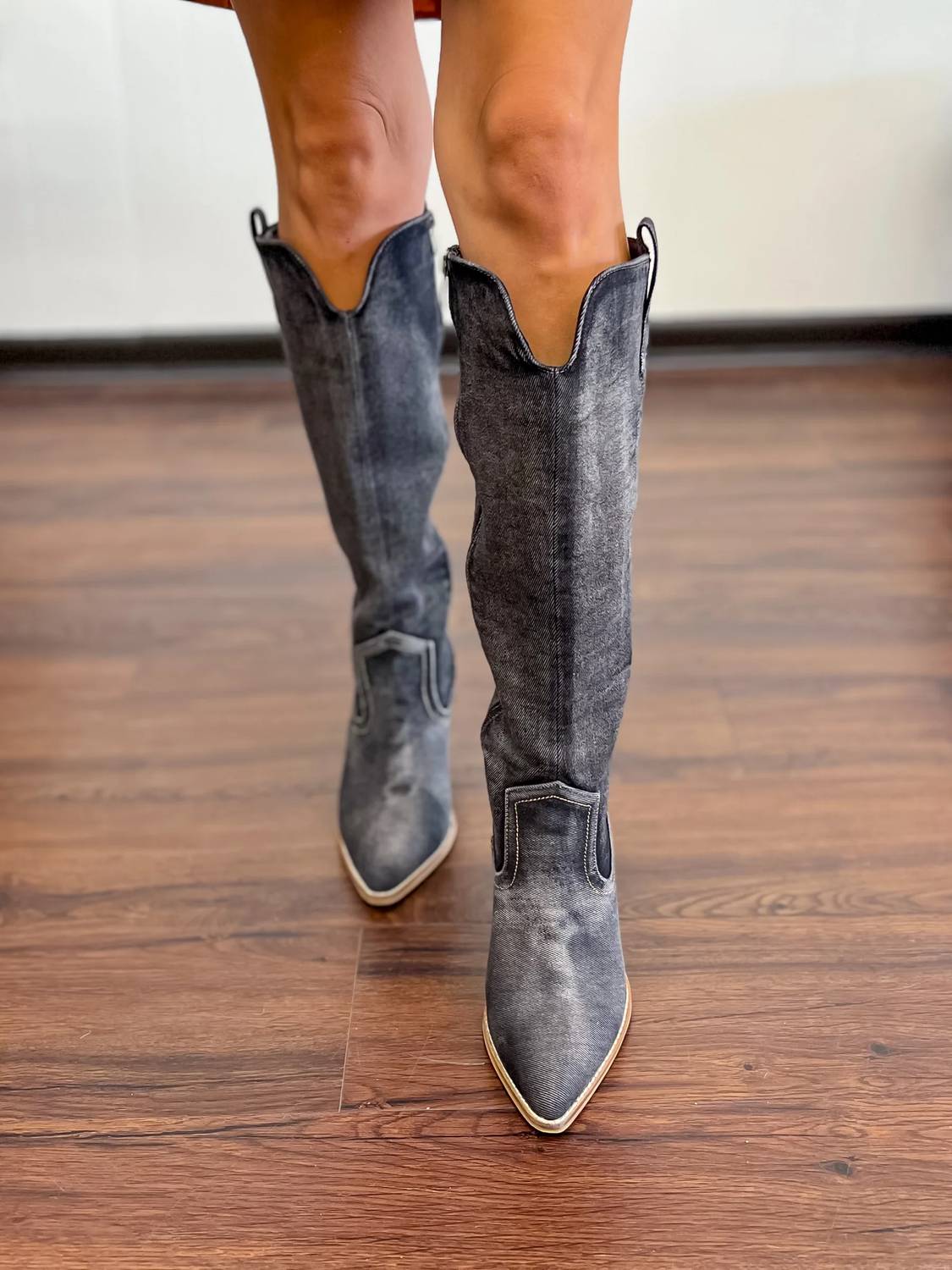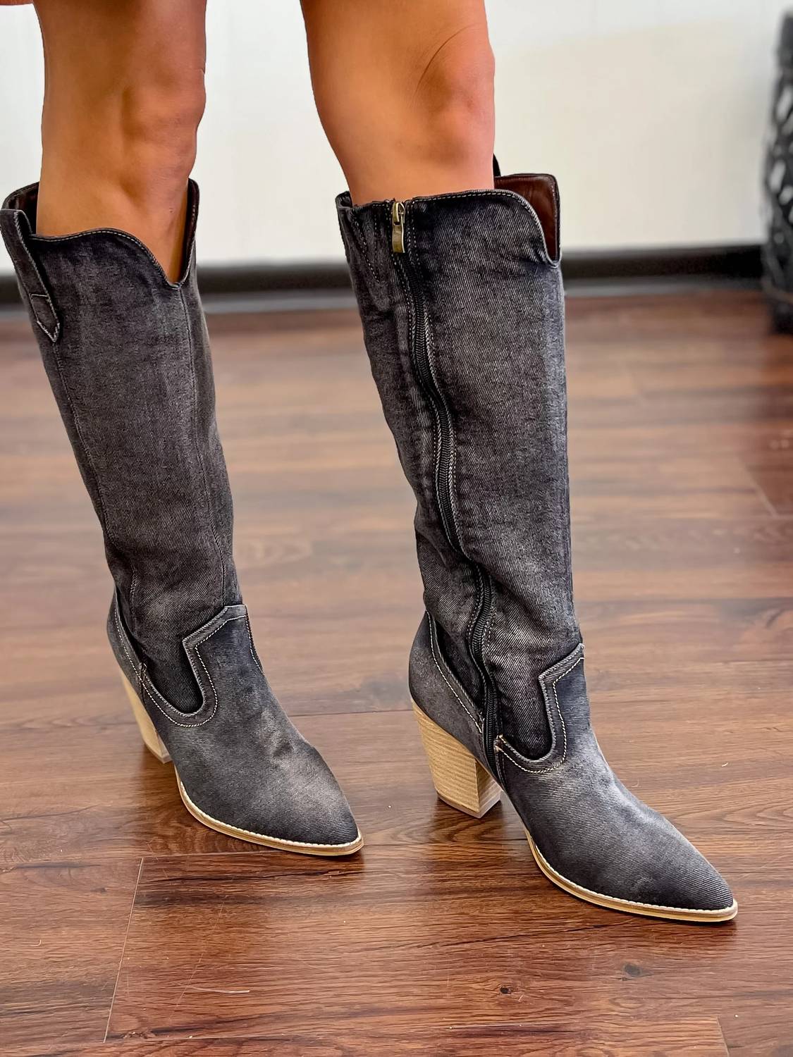 These over the knee boots are equal parts classic and cool. Step into style with the Women's Talk Is Cheap Washed Boots by Hey Girl by Corkys, combining trendy design with comfort. Crafted from dark wash denim, these over-the-knee boots feature a chic pointed toe and a block heel with a height of 3 inches. Enjoy easy wearability with their convenient zipper closure. Ideal for making a statement, these boots are perfect for elevating any ensemble.