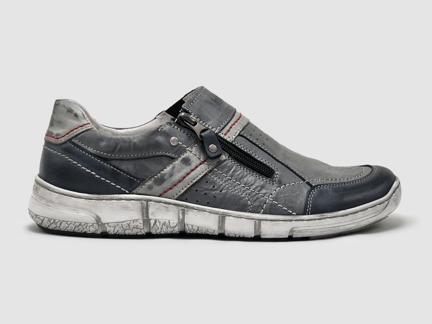 Step into style and comfort with KCR Group's Men's Everyday Zip-Up Slip-On Leather Shoes in Dark Grey. Expertly crafted from high-quality leather, these slip-ons feature a round toe and a convenient zipper closure, eliminating the need for laces. Perfect for fall travel and streetwear occasions, these shoes boast a flat heel with a height of 1" and under, ensuring all-day wearability. Ideal for men's casual looks, these shoes are a versatile addition to your everyday wardrobe.
