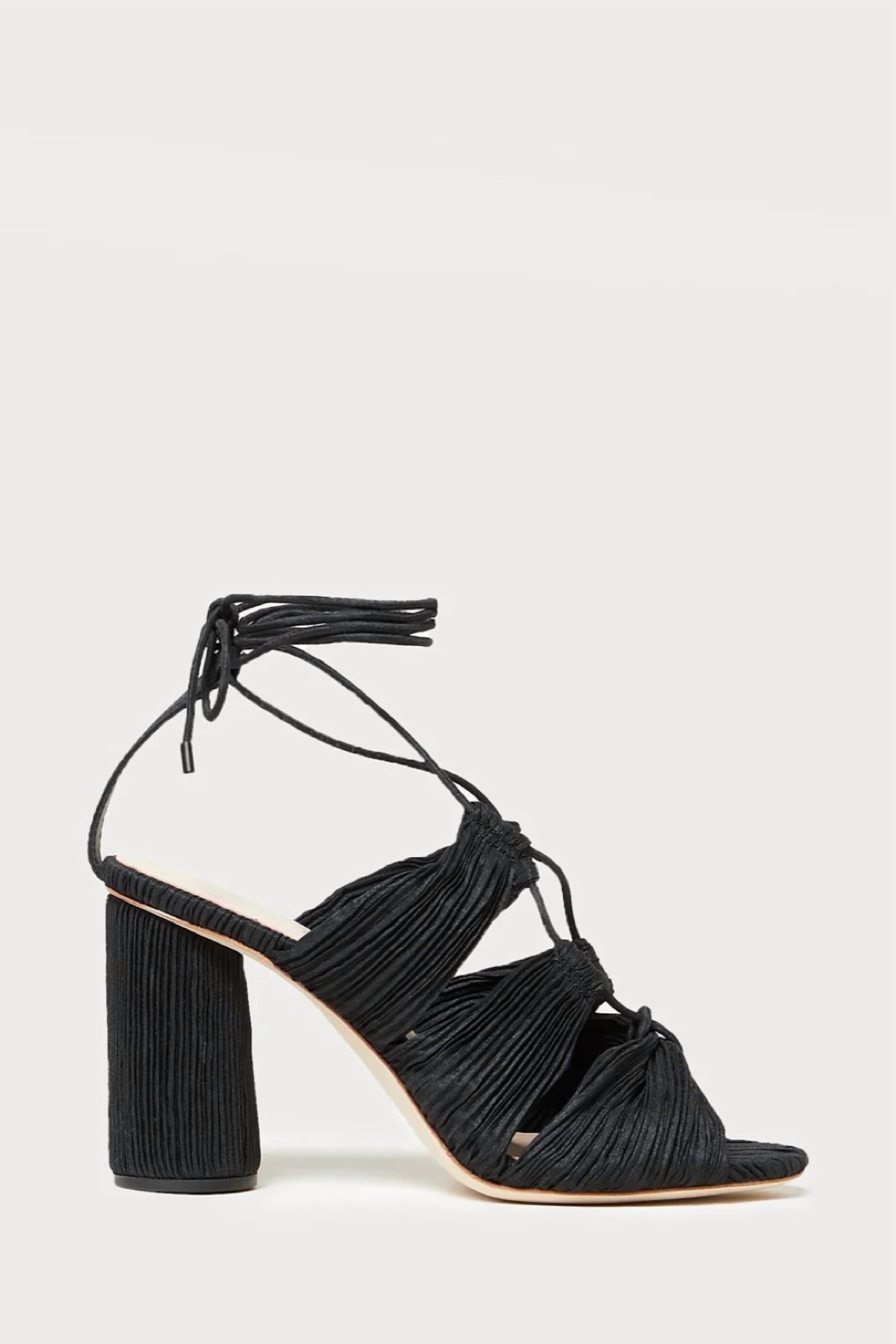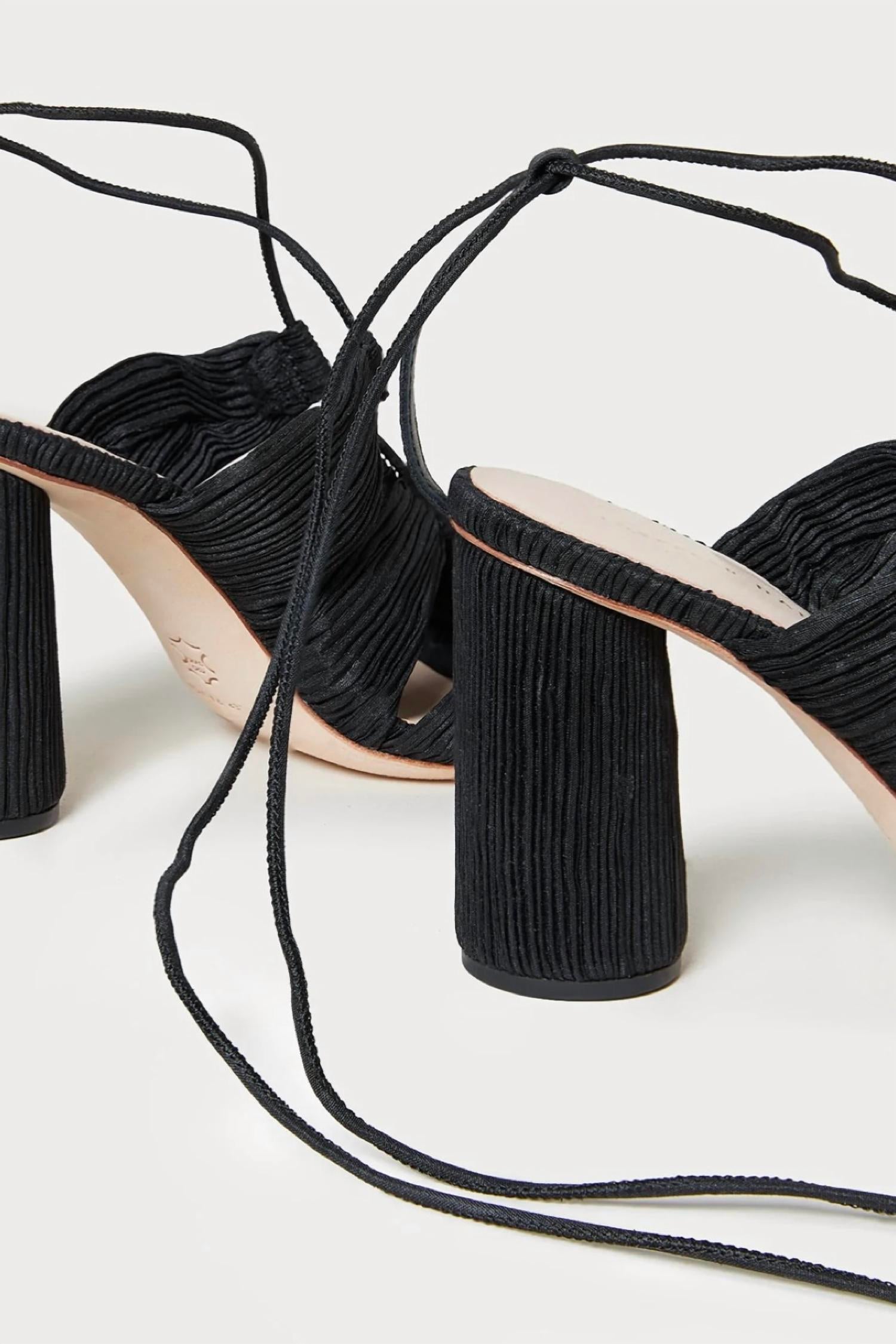 Flowy dresses, cropped pants, and even jumpsuits... this sandal works with them all! Step into style with the Women's Teresa Lace Up Sandal by Loeffler Randall, featuring an elegant pleated design. Made with an upper of 100% polyester and a sturdy 100% bovine leather outsole, these sandals come in a classic black hue. The open-toe design showcases a chic lace-up closure, while the 3.5-inch block heel adds height and sophistication to your look. Whether for an anniversary or a spring outing, enjoy comfort with the padded footbed that supports all-day wear.
