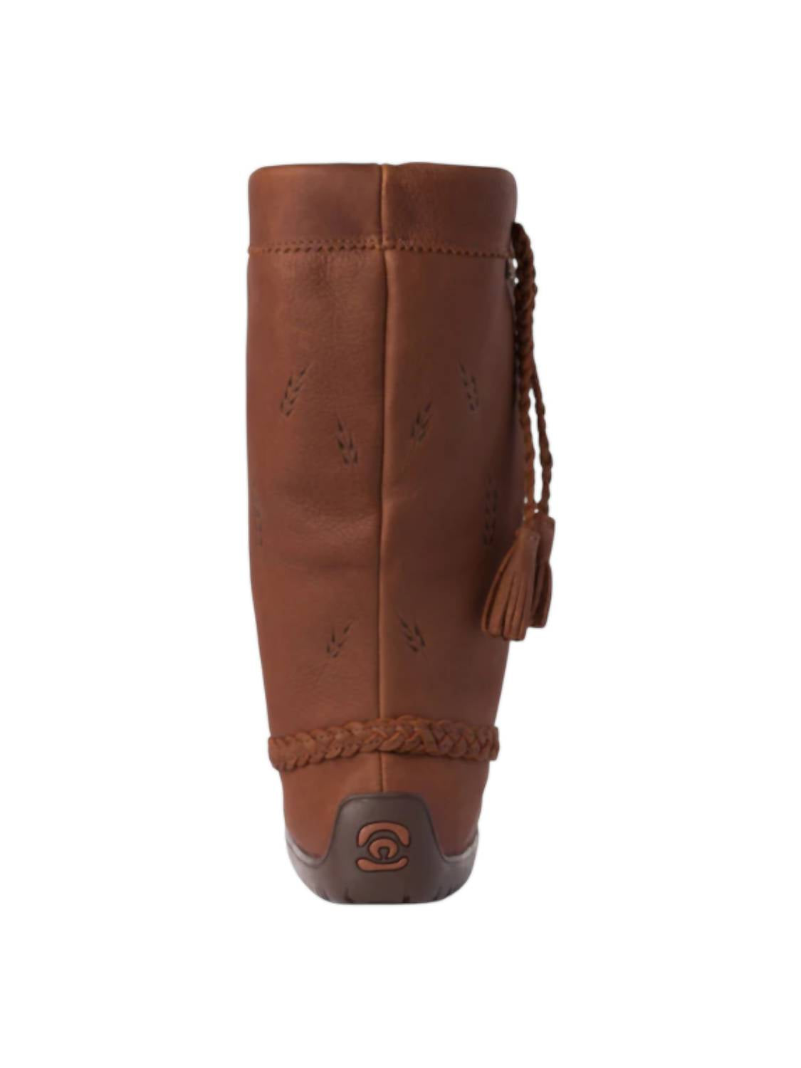 These stylish over the knee boots will look great with denim, dresses or skirts. You can't go wrong! Step out in style with the Women's Waterproof Tamarack Boot by Manitobah Mukluks, designed to blend minimalist beauty with practical features. These Tobacco-colored, over-the-knee boots are crafted from grain leather and feature a cozy sheepskin shearling foot lining and a polyester faux fur shaft lining. Boasting a shaft height of 13.5 inches and a circumference of 16 inches, they ensure a snug, comfortable fit. With their Glacier Grip Tipi Sole and waterproofing up to four inches, these boots are rated to withstand temperatures as low as -32°C, making them perfect for cold-weather wear.