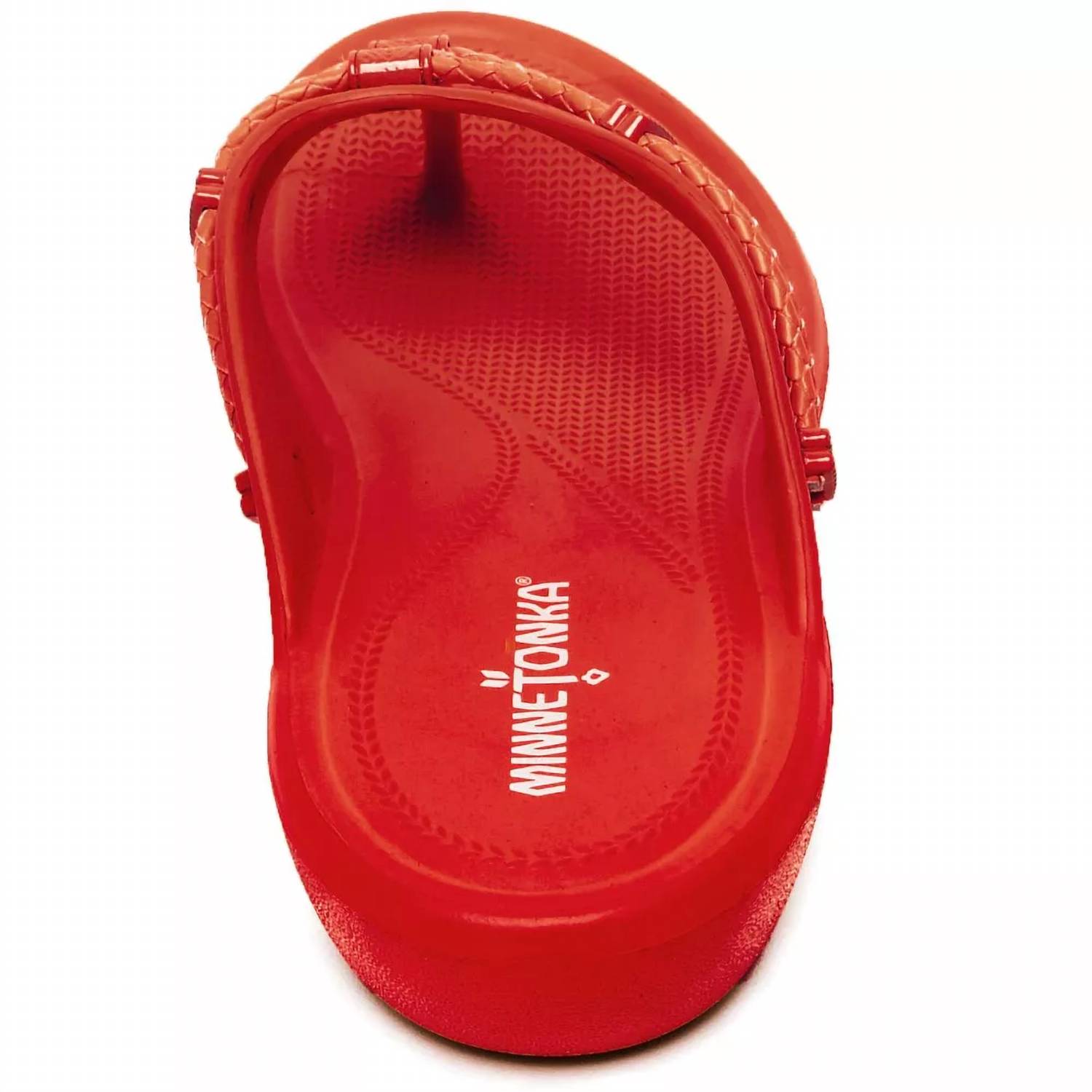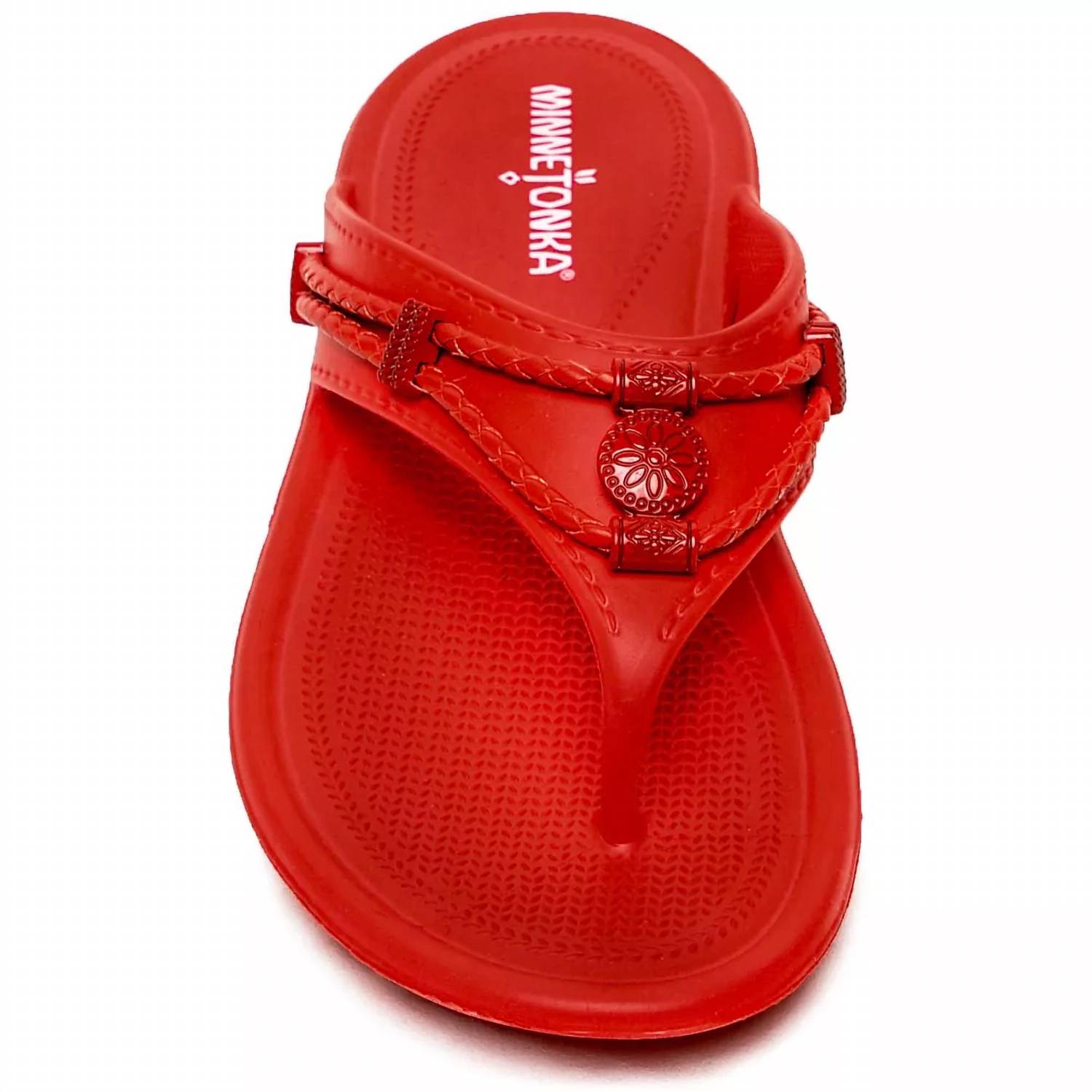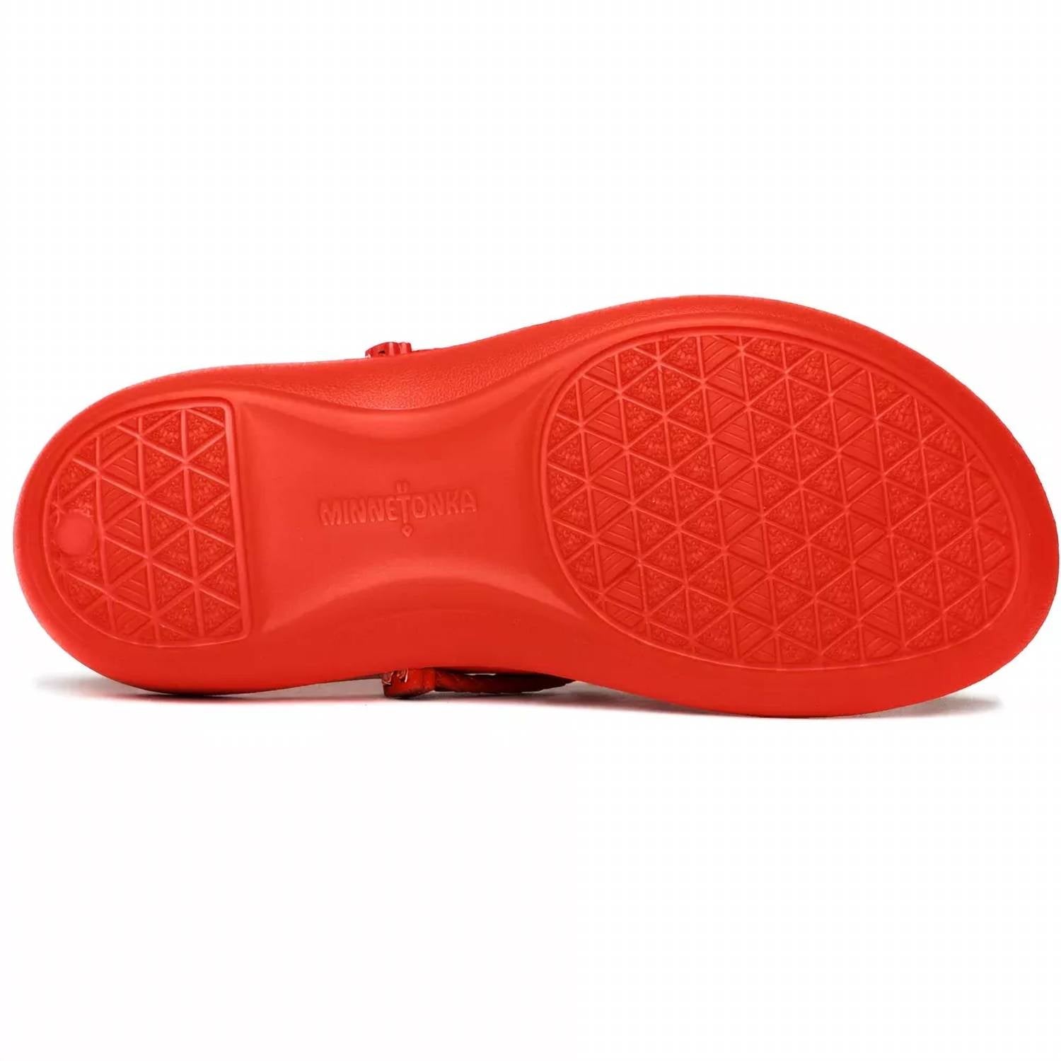 Flowy dresses, cropped pants, and even jumpsuits... this sandal works with them all! Step into vibrant summer style with the Women's Silverthorne Prism Flip Flops by Minnetonka, presented in an eye-catching Chili Pepper hue. These sandals boast a lightweight molded EVA construction and are water-friendly, perfect for beach days or casual outings. Designed with an open toe and flat heel featuring a low 1.25-inch heel height, they ensure comfort and style. True to size, these sandals showcase brightly colored metal ornaments, making them a standout choice for streetwear trends.