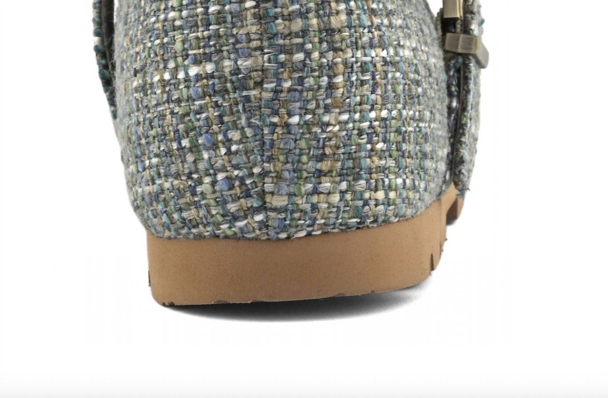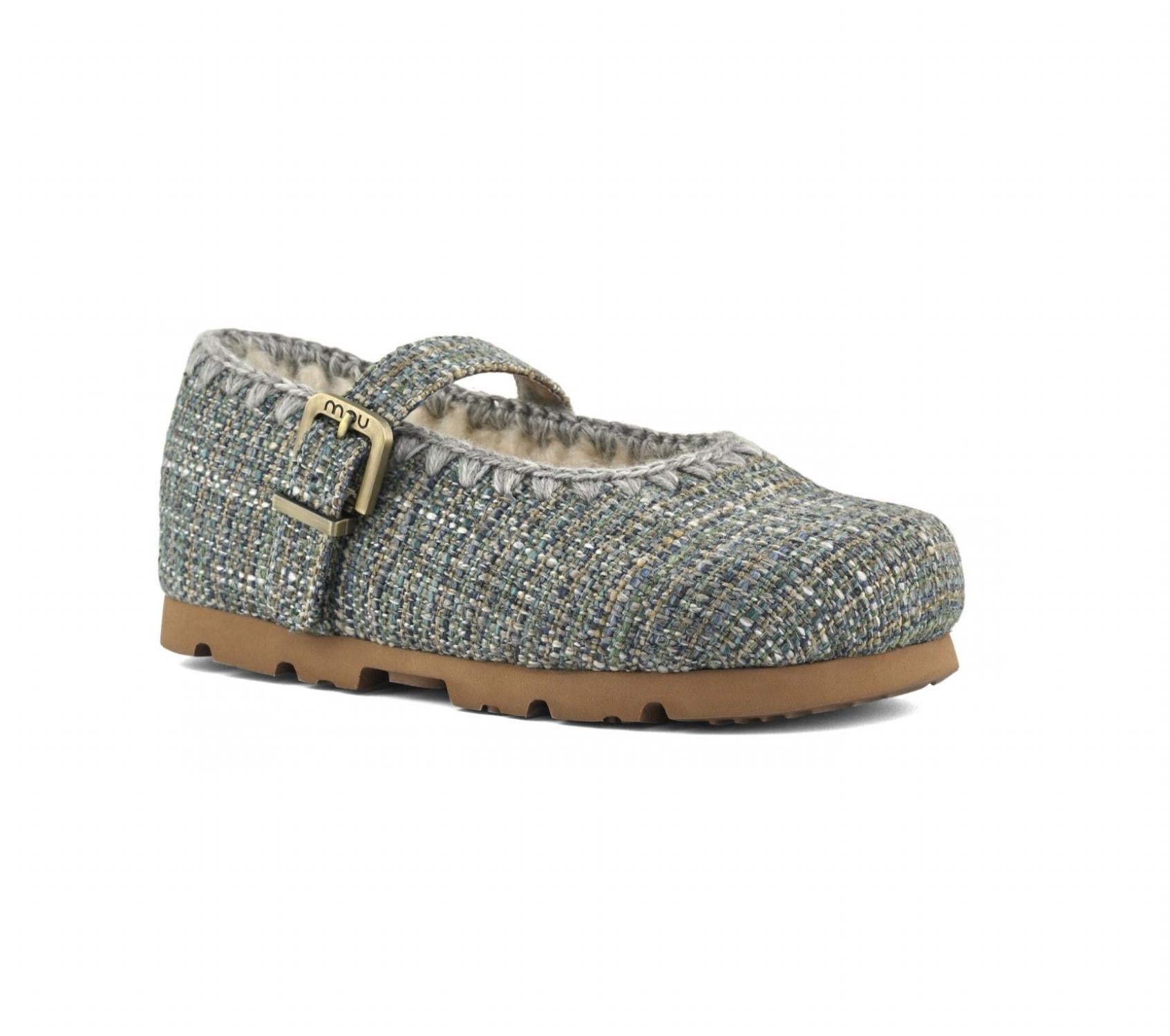 A preppy yet feminine take on the classic loafer. Introducing the Women's Winter Bio Mary Jane by mou, a timeless addition to your seasonal wardrobe. Crafted with a tweed textile upper, this shoe features a comfortable front strap closure and showcases mou's signature hand-crochet wool stitching. Enjoy the soft sheepskin insole, paired with a lightweight rubber outsole for durable wear. Perfect for vacation getaways and preppy spring styles, this medium-width flat heel design caters to an adult women's audience.
