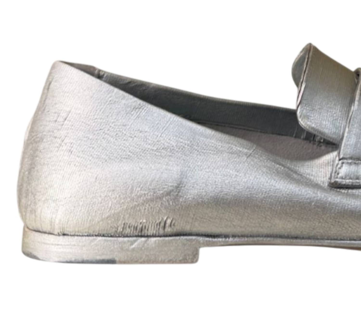 A preppy yet feminine take on the classic loafer. Discover timeless elegance with the Women's Blair Leather Penny Loafer by Officine Creative, meticulously handcrafted in Italy. These silver loafers are made from 100% leather, featuring a 3D silhouette with a low-profile flat heel, measuring 10 mm. The design is complemented by an artisanal textured effect and a shiny gold deep-dye treatment, making them perfect for a dinner party or New Year's Eve celebration. Enjoy the unlined interior for a naturally comfortable fit.