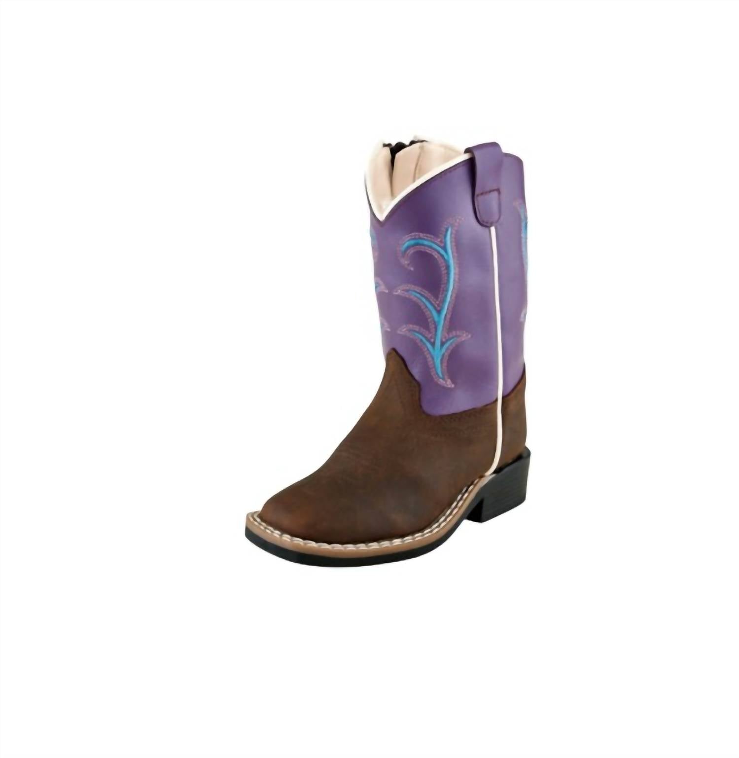 Step stylishly with the Infant Old West Boots, designed for your little cowboy's costume party. These boots showcase a bold purple and brown all-leather foot and shaft, complemented by a decorative 2-row fancy stitch with medallion detailing. Featuring a natural welt, white double row welt stitch, and an easy-access side zipper, they promise a secure fit. The TPR outsole and broad square toe ensure comfort while their playful round toe shape makes them perfect for spring adventures. Made for toddler boys, these boots embody a blend of classic western style and practical design.
