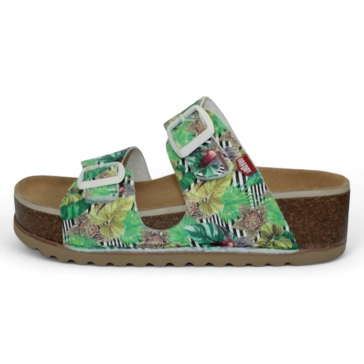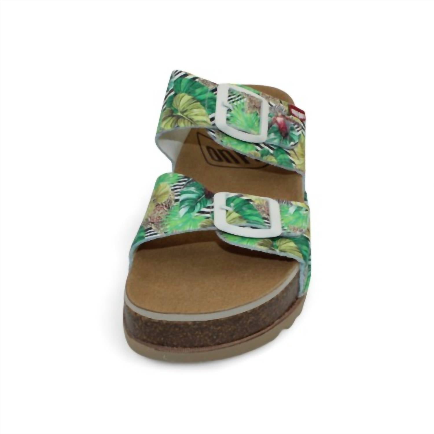 Elevate your footwear game with these adorable wedges. The Women's Aurora Wedge Heel Slide Sandal by OnFoot, in the vibrant Botanica color, is a summer essential for a vacation-ready look. Designed with a 1 3/4" heel and a 1 1/4" platform, these sandals feature adjustable straps with buckle closures. Made in Spain, they provide superior comfort with a Zen footbed that massages pressure points for stress relief and enhanced circulation. Crafted with a leather upper, synthetic lining, and a rubber and synthetic sole, these open-toe wedges also include an EVA midsole for added cushioning.