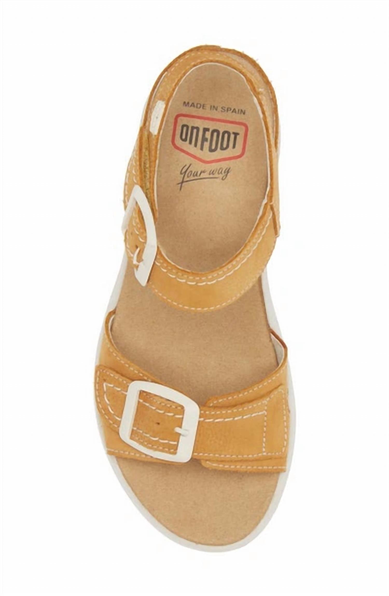 Elevate your footwear game with these adorable wedges. Discover the Women's Orleans Wedge Sandal by OnFoot in a chic Ocre hue, perfect for summer streetwear and vacation styling. Crafted with a leather upper, this sandal features adjustable straps with a buckle closure and an open toe design. Made in Spain, the stylish platform wedge measures at a comfortable 2.75 inches, offering a mid-height lift while ensuring comfort with its Zen footbed that massages pressure points. This wedge sandal merges trendy aesthetics with practical comfort, making it a must-have for your footwear collection.
