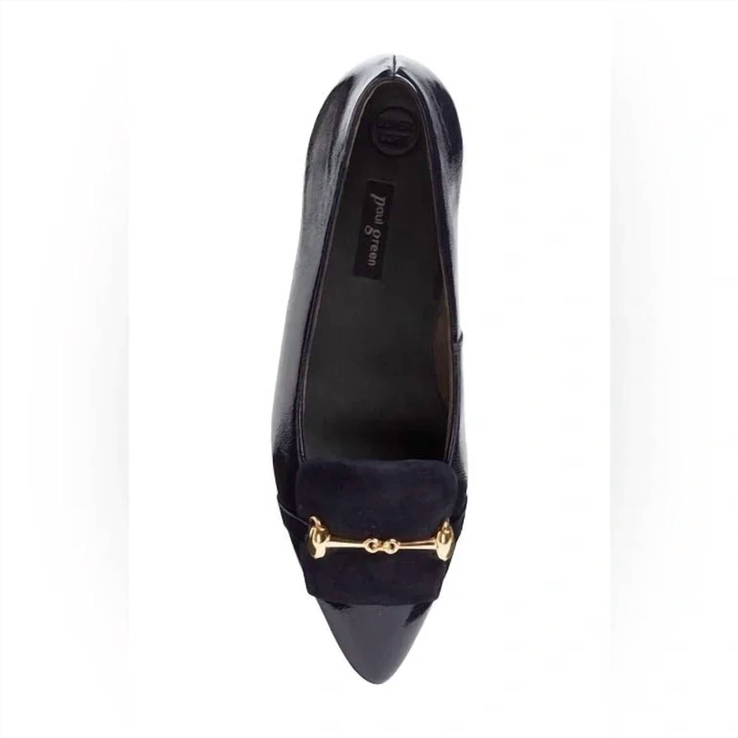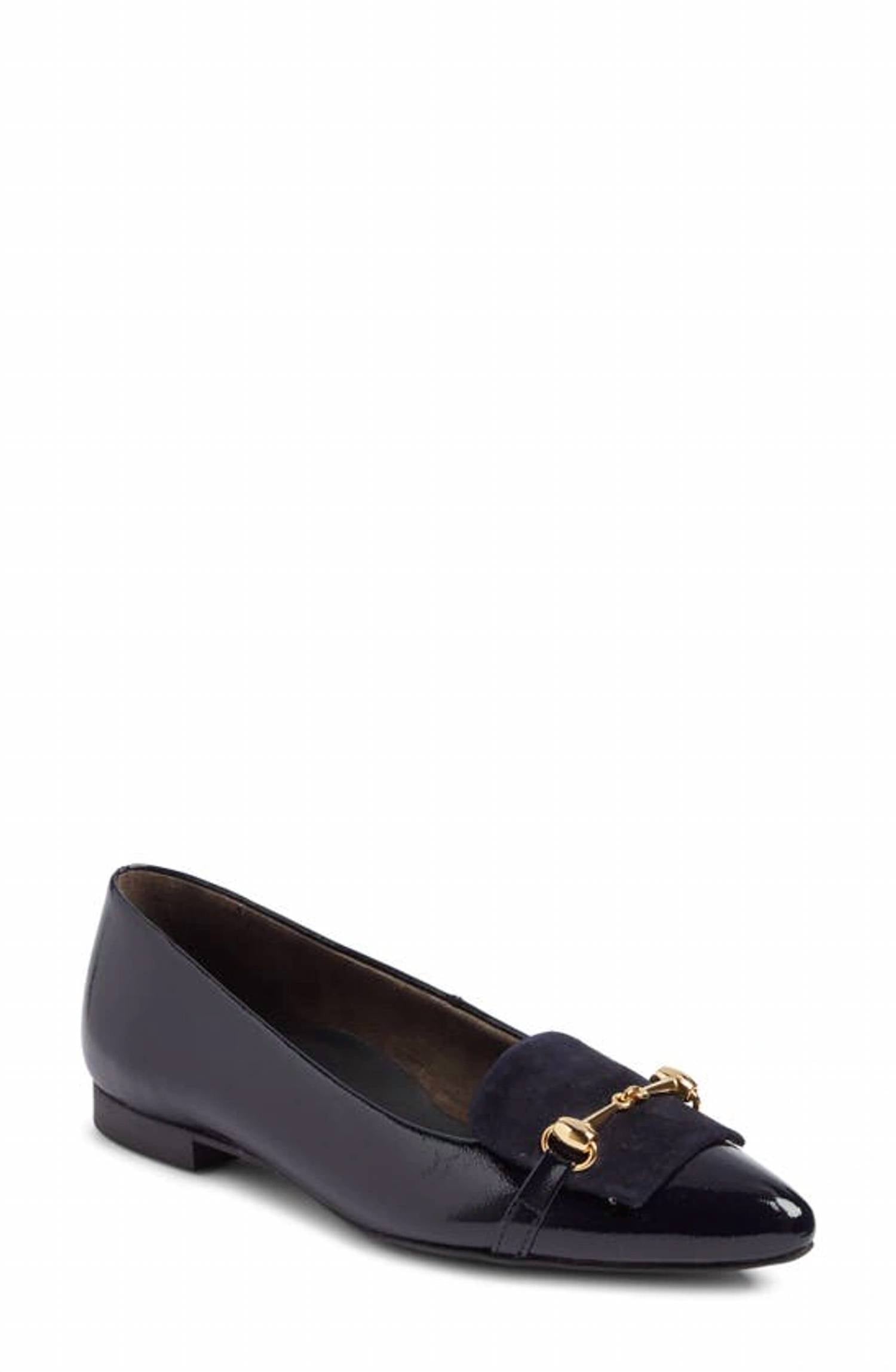 A preppy yet feminine take on the classic loafer. PAUL GREEN Selena Ocean Blue Leather Flats Part loafer, part ballet flat, this hybrid shoe shines in patent leather with gleaming bit hardware and suede patch details. Classy flat shoe perfect for the office or a tailored outfit. Cushioned footbed Leather upper and lining synthetic sole Imported Ocean Blue, navy blue color Gold hardware Patent leather / suede combo