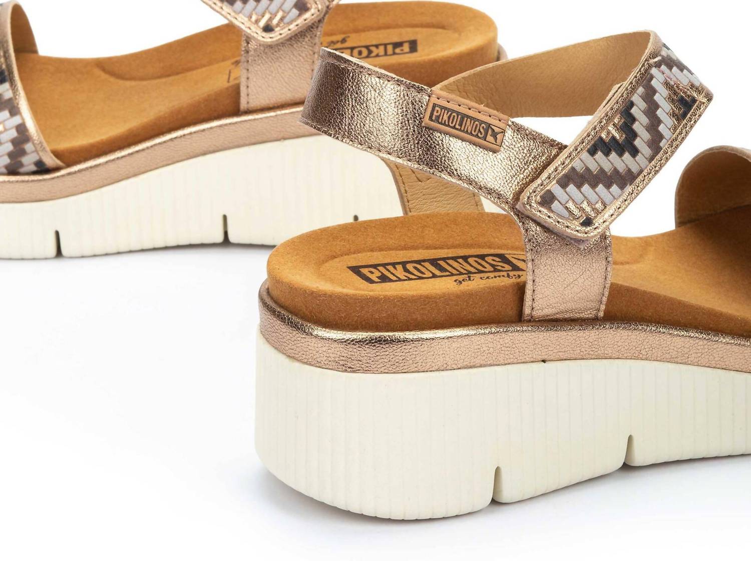 Classicly cute and all-day-wearable. We love this sandal. Step into effortless style with the Women's Gomera Wedge Sandal by PIKOLINOS, designed for those sunny days in elegant Champagne. These sandals feature a 6 cm wedge heel, crafted with 100% goatskin leather for the instep and a comfortable inner lining made of 75% other materials and 25% textile. The ultra-light synthetic sole supports your stride while the cushioned insole ensures extra comfort. Complete with a convenient hook and loop closure, these open-toe sandals deliver both confidence and boho chic flair for any vacation outing.