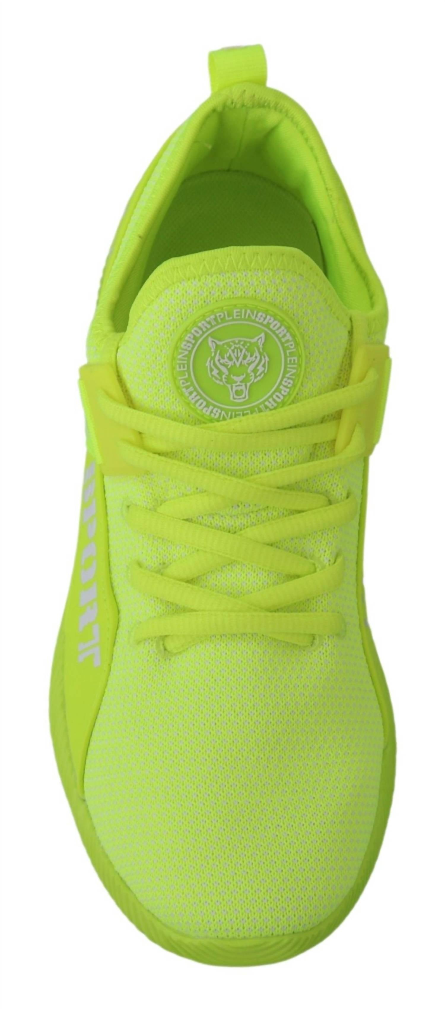 Cute, functional, and comfortable. These sneakers check all the boxes. Step out in style with the Women's Msc Sneakers by Plein Sport, crafted for the season in an eye-catching Carter Yellow. These sneakers boast a breathable polyester upper, ensuring comfort and durability for every spring adventure. Thoughtfully designed with a flat heel and round toe shape, this pair features renowned Plein Sport logo details for a touch of sophistication. Enjoy the resilience of a rubber sole, perfect for long-lasting wear.