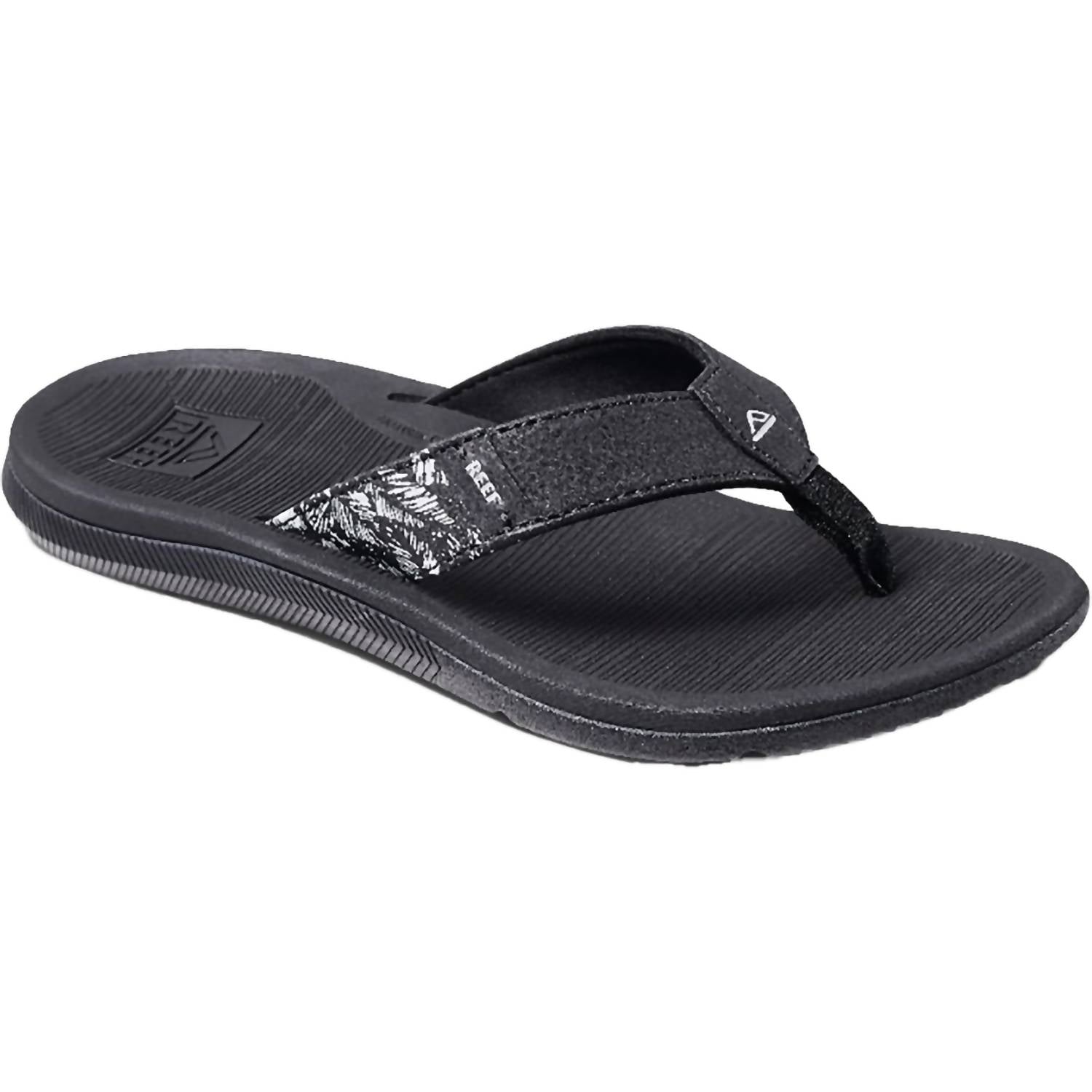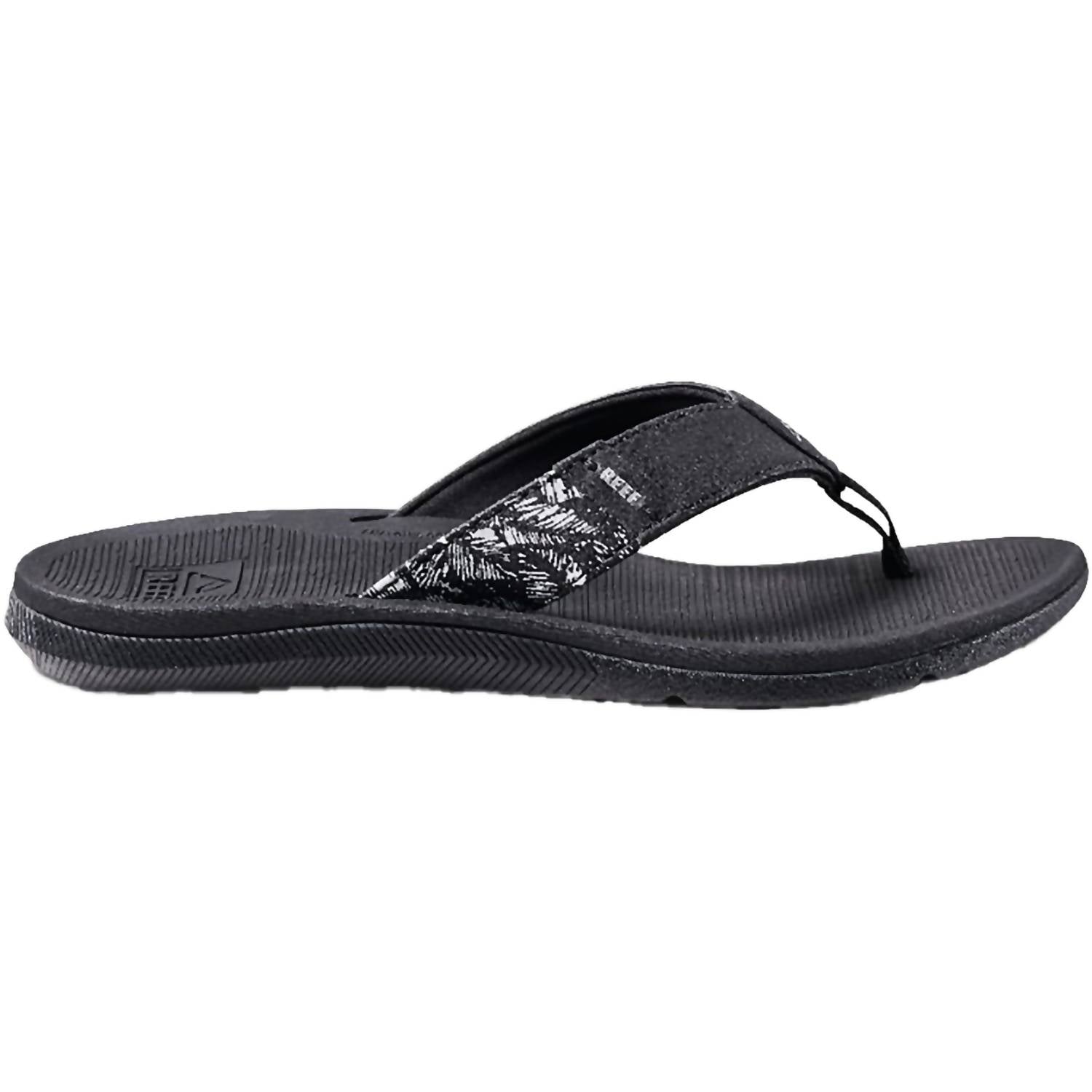 Flowy dresses, cropped pants, and even jumpsuits... this sandal works with them all! Introducing the REEF Women's Santa Ana Sandals in a chic Black/White Synthetic finish, perfect for a casual beach day or adding a touch of Boho Chic to your summer look. Crafted from faux leather, these sandals feature soft pebbled vegan leather straps and a super soft padded jersey lining for maximum comfort. The super soft compression molded EVA footbed with anatomical arch support and a bamboo-inspired texture ensures comfort and traction, while the non-marking rubber cupsole, inspired by California palm trees, offers durability. Ideal for an open toe, flat heel style with a medium width, they are made with attention to detail for those sunny summer occasions.