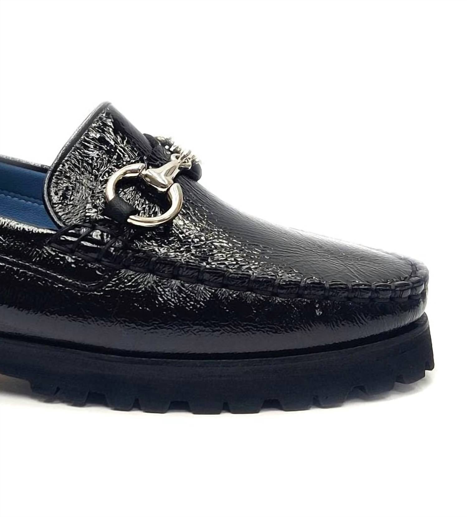 A preppy yet feminine take on the classic loafer. Introducing the Women's Soho Penny Loafer by Robert Zur, a refined choice for the modern wardrobe. Tailored from soft, crushed patent leather, these loafers showcase a sophisticated silver ornament and double cable square stitch detailing. The lightweight Vibram® sole promises enhanced durability and traction, while the nap suede heel pocket provides anti-slippage comfort. Lined in lambskin, known as True Glove, these loafers ensure a snug fit and ultimate softness.