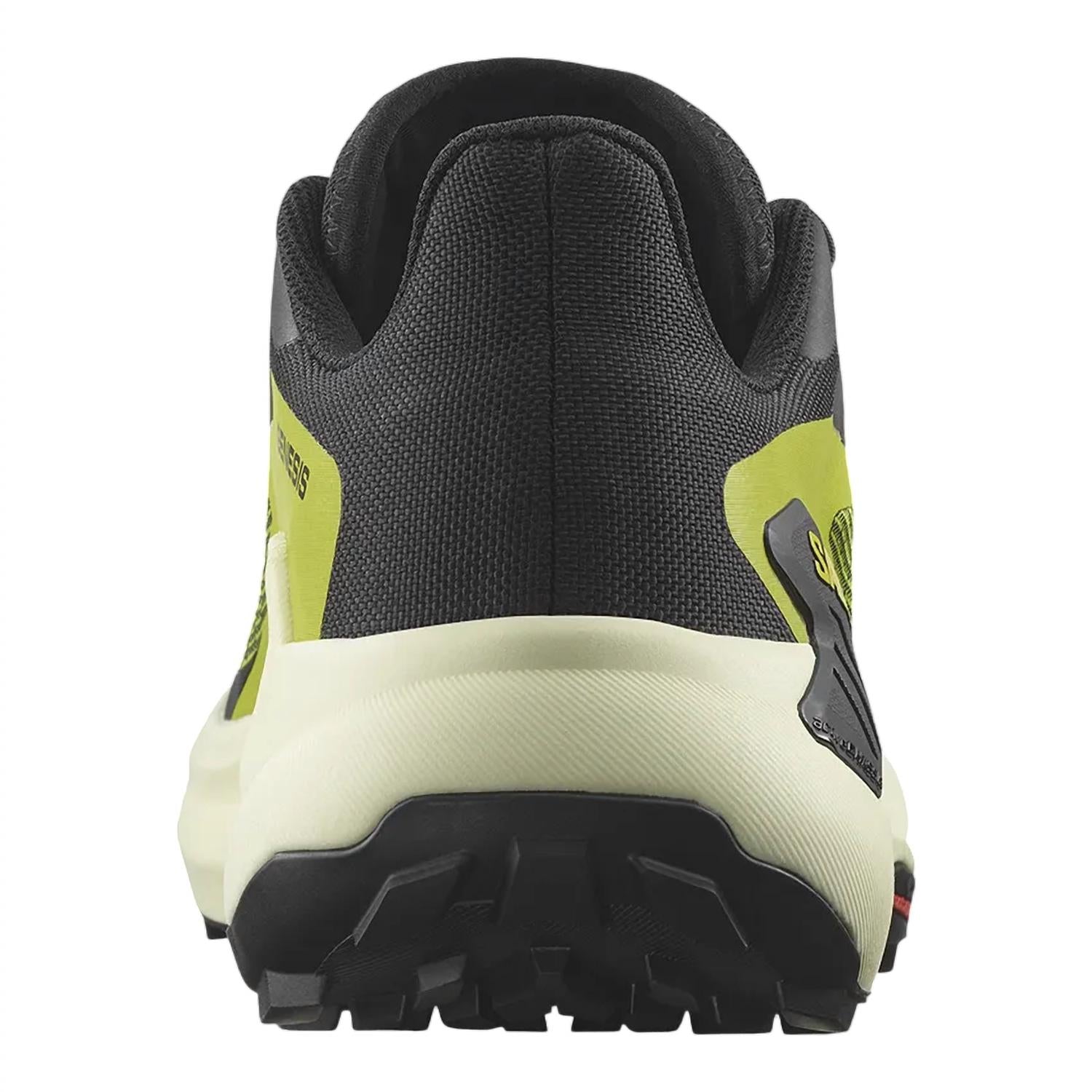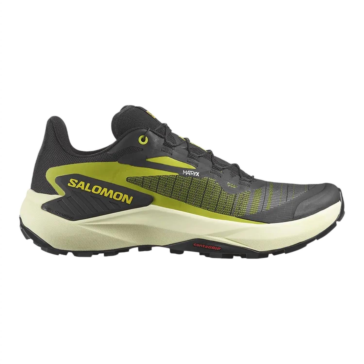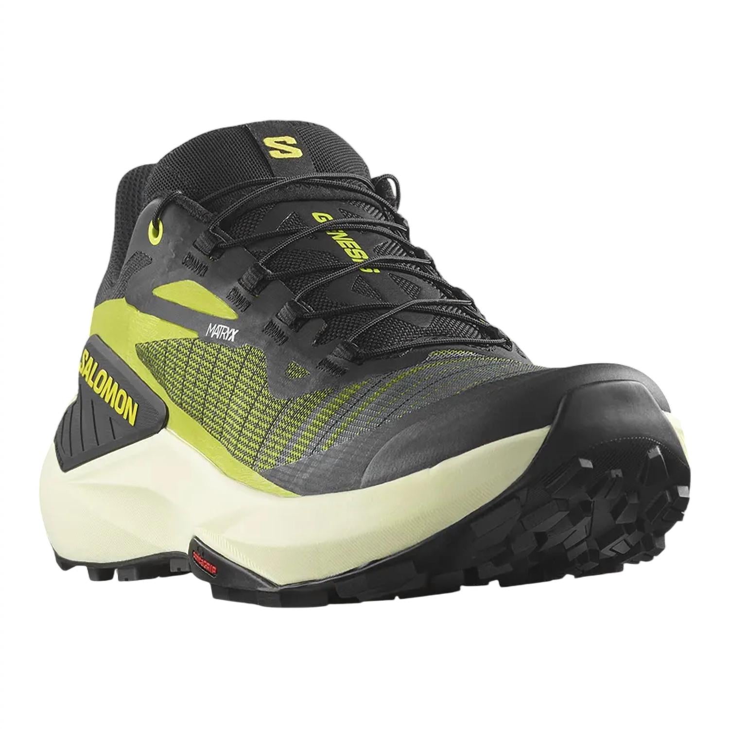 Introducing the Men's Genesis Trail Running Shoes by SALOMON in sleek black, crafted for the adventurous spirits. Featuring a mesh and synthetic upper with a durable rubber outsole, these shoes offer dynamic support and reliable grip for the toughest terrains. Engineered for those who hit the trails 2-3 times a week, the round-toe design ensures comfort and performance. Ideal for spring hiking adventures, these shoes embody the athleisure trend with their functional yet stylish design.