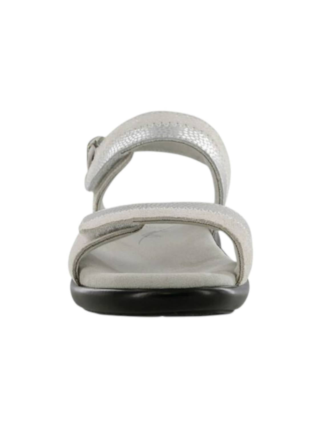 Flowy dresses, cropped pants, and even jumpsuits... this sandal works with them all! Experience ultimate comfort with the SAS Women's Nudu Heel Strap Sandals in an elegant Silver Mist color. Crafted from two-toned leather, these sandals feature adjustable leather straps and decorative stitching for a unique style. The plush contoured insole is covered in soft Super Suede™, thoughtfully designed to cradle your foot’s natural curves. With a heel height of 1.375 inches, these sandals offer stability through their broad footbed and all-day cushioned comfort.