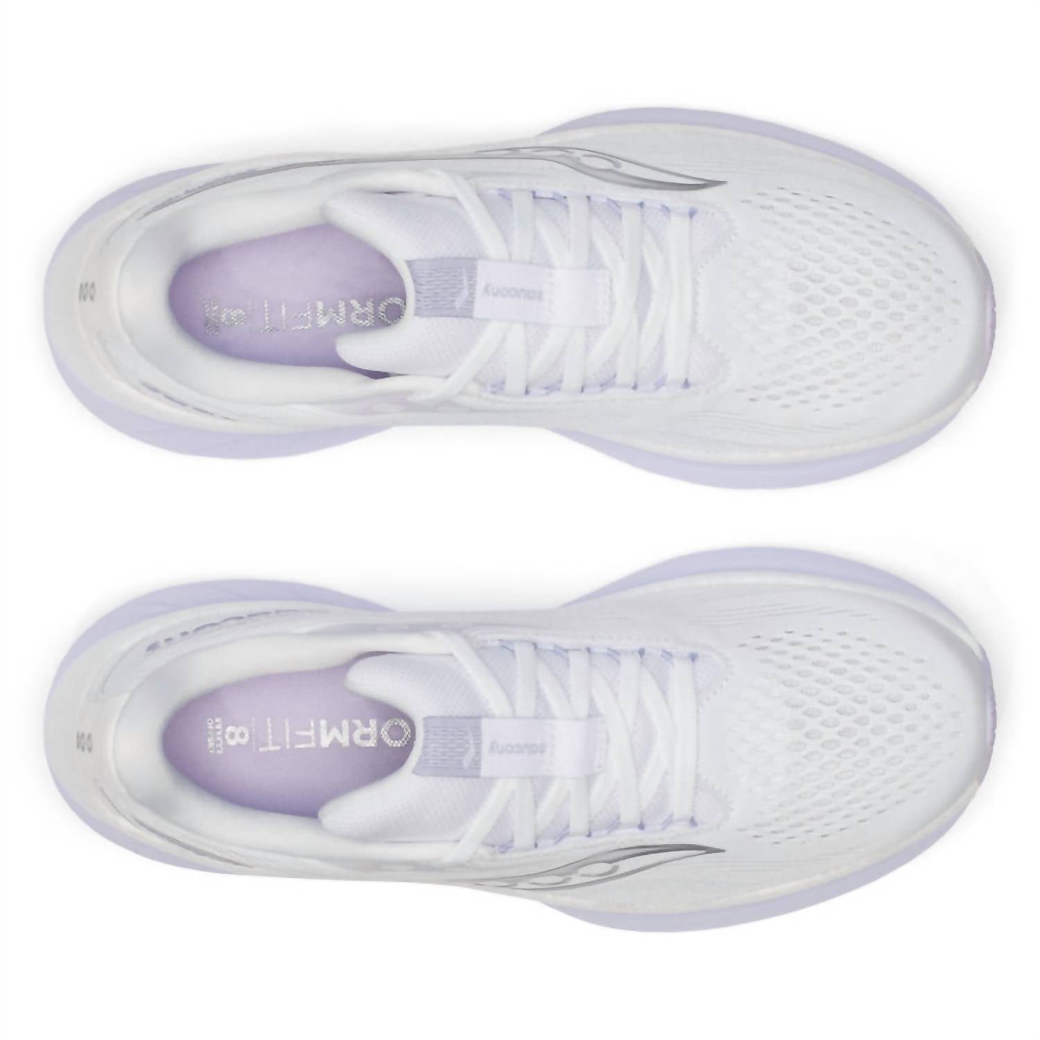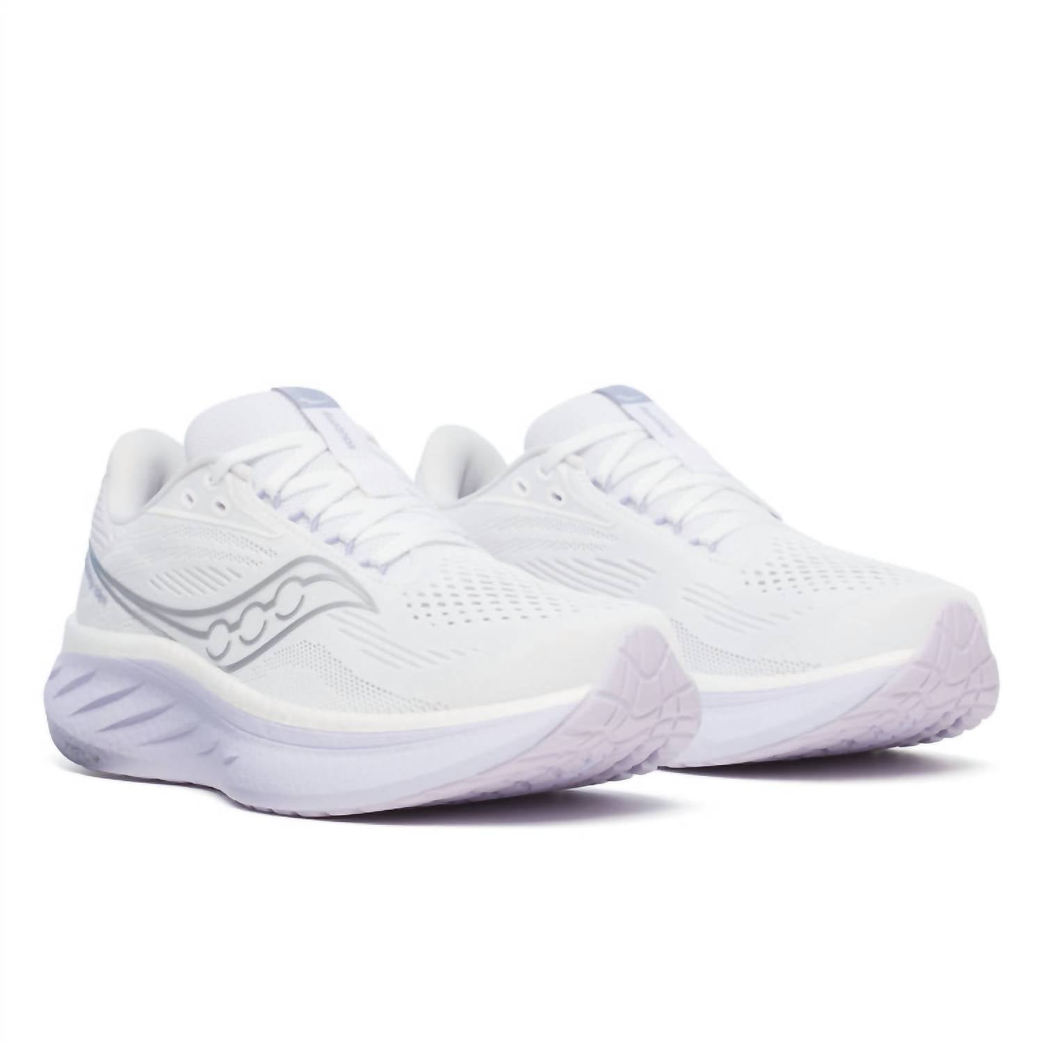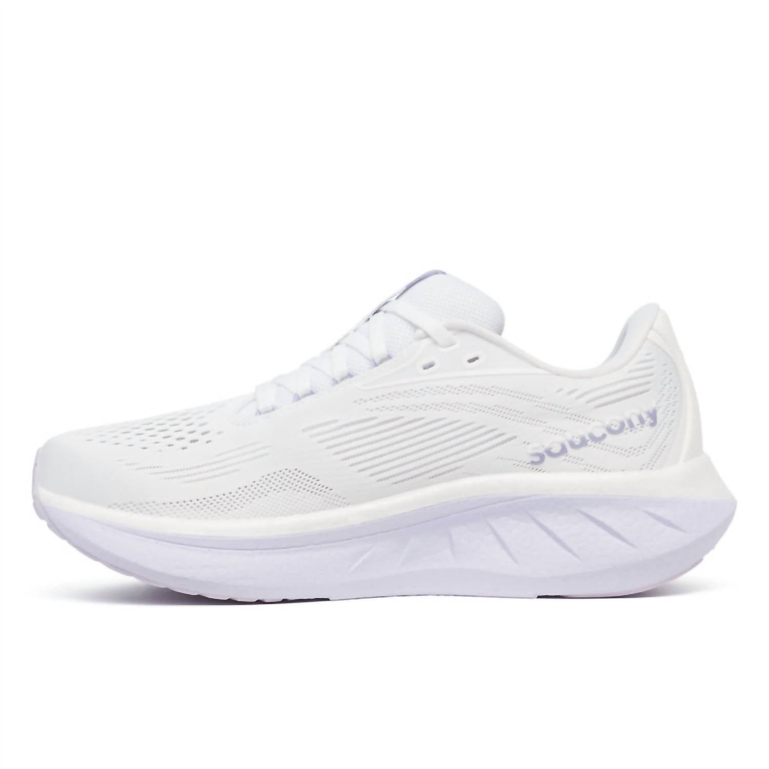 When fashion meets function. Meet the Saucony Women's Ride 18 Wide Running Shoes in a sleek White/Thistle colorway, crafted for ultimate comfort and versatility. These athletic shoes boast a round toe and flat heel under 1", suitable for fitness and workout occasions. Featuring the innovative PWRRUN+ foam, they offer lighter, softer, and more responsive cushioning. The adaptable engineered mesh upper enhances breathability and provides a stretch fit.
