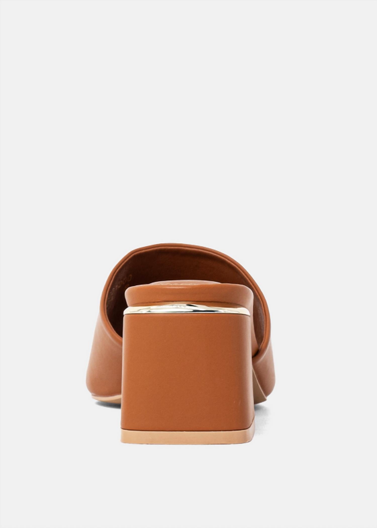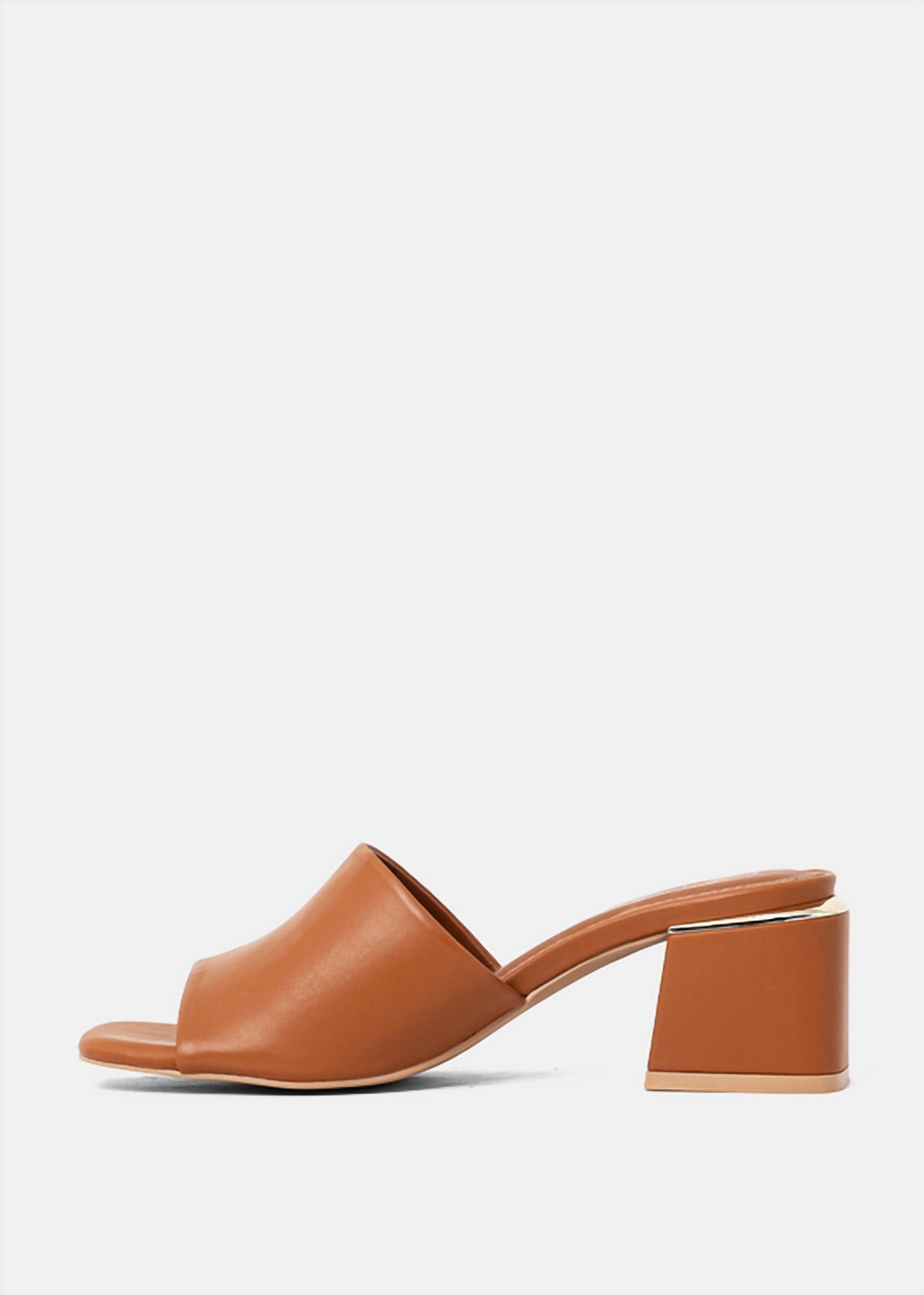 Pair these beauties with your favorite skinny jeans or dress for a night out on the town. Elevate your style with the Women's Glinda Block Heels by SHU SHOP in a chic Camel color. Crafted from soft faux leather, these mules feature a sculptural block heel with a metallic accent, offering a modern touch to a classic design. The minimalist one-band silhouette and neutral tone make them the perfect accessory for any wardrobe, while the slip-on style ensures easy wear. Showcasing a squared toe for a polished finish, these heels are ideal for transition through spring occasions, whether paired with wide-leg denim or summer tailoring.