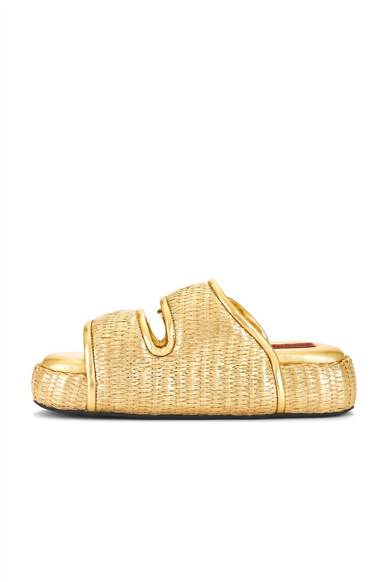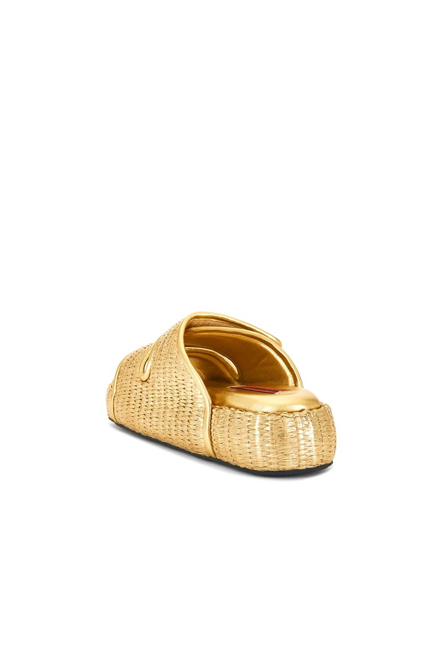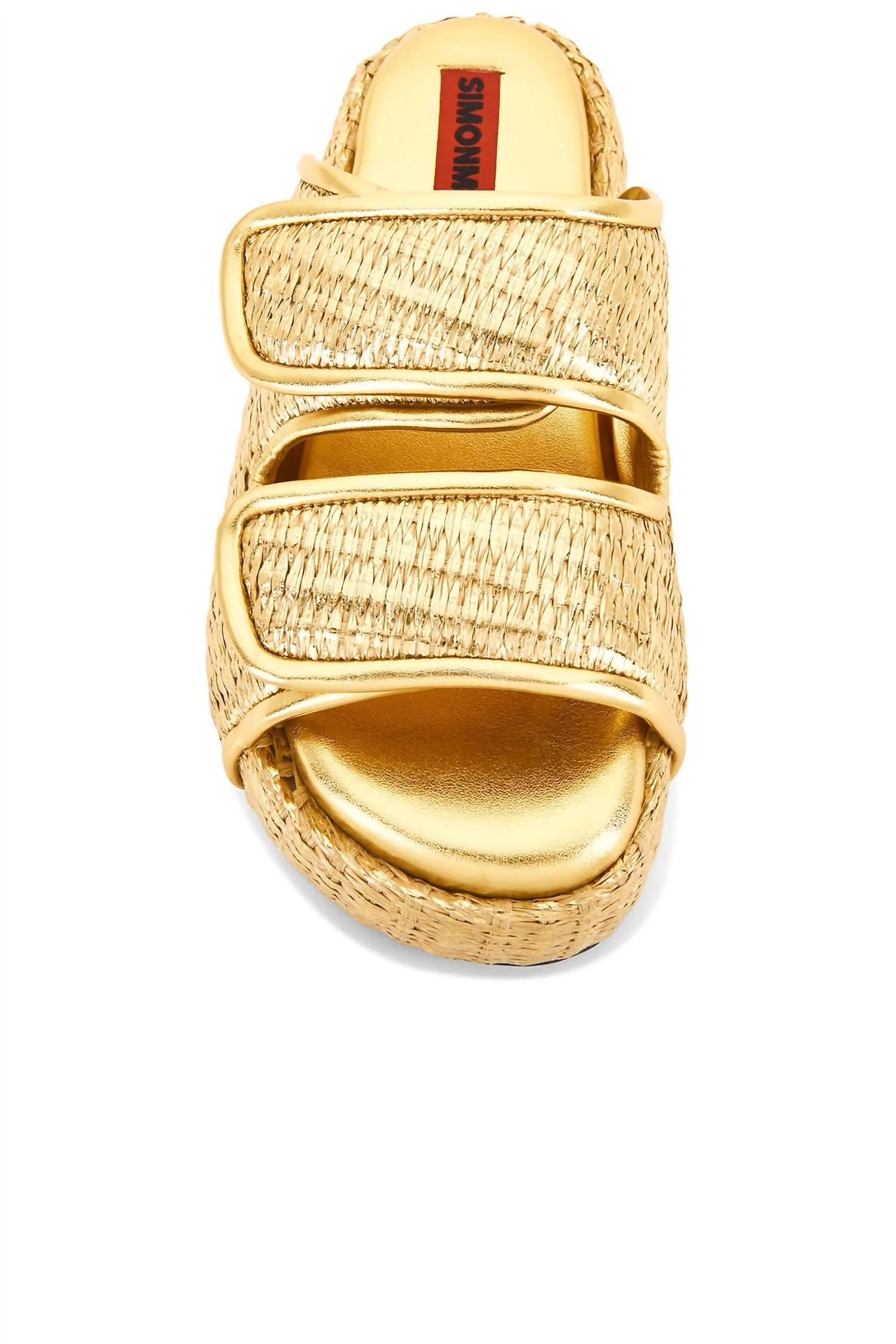 Classicly cute and all-day-wearable. We love this sandal. Step into summer with the Women's Metallic Cro Slide Sandal by SIMON MILLER, a chic gold sandal designed for standout style. Made in China, these sandals boast a coated metallic raffia upper paired with a comfortable rubber sole and slip-on styling. The design features dual adjustable Velcro straps for a customizable fit and a faux leather footbed and lining for added comfort. With an open toe and a 40mm (1.5 inch) platform heel, these sandals seamlessly combine fashion with function.