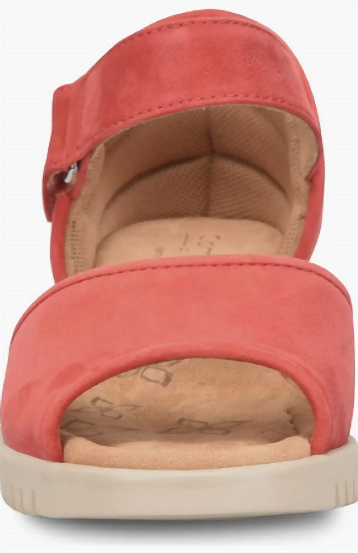 Flowy dresses, cropped pants, and even jumpsuits... this sandal works with them all! Step into sophisticated comfort with the Women's Daniella Brushed Italian Leather Peep Toe Wedge Sandals by Sofft. These red sandals, crafted from premium leather, are a minimalist's dream perfect for summer adventures. Featuring an open toe design and a comfortable wedge heel, they offer style for every occasion. Elevate your hiking wardrobe with this chic and versatile footwear essential.