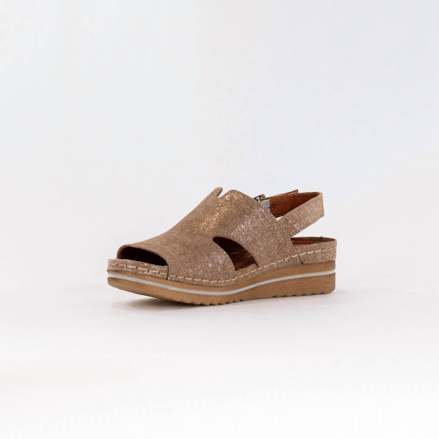 Elevate your footwear game with these adorable wedges. Step into sophistication with the Women's Wedge Sandal by V-Italia, featuring luxe Italian leather in a chic camel metallic finish. Designed for everyday elegance, these sandals boast a comfortable wedge heel and a stylish peep toe, blending durability and fashion seamlessly. Material: Leather. Made in Poland. Perfect for a spring vacation ensemble, these sandals offer a medium width for a flattering fit.