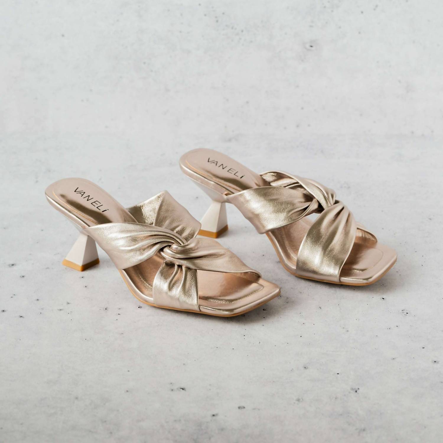 This sandal will take you from brunch to dinner and everything in between. Elevate your summer style with the Women's Taber Sandals by VANELi, offered in a chic Shell Mercury Metallic. Crafted from soft, supple glove leather, these sandals feature an open square toe with twisted vamp straps for a flair of elegance. With a comfortable 2.5-inch kitten heel, they perfectly balance style and wearability. The ultimate choice for an engagement occasion, step confidently into summer with these sophisticated sandals.