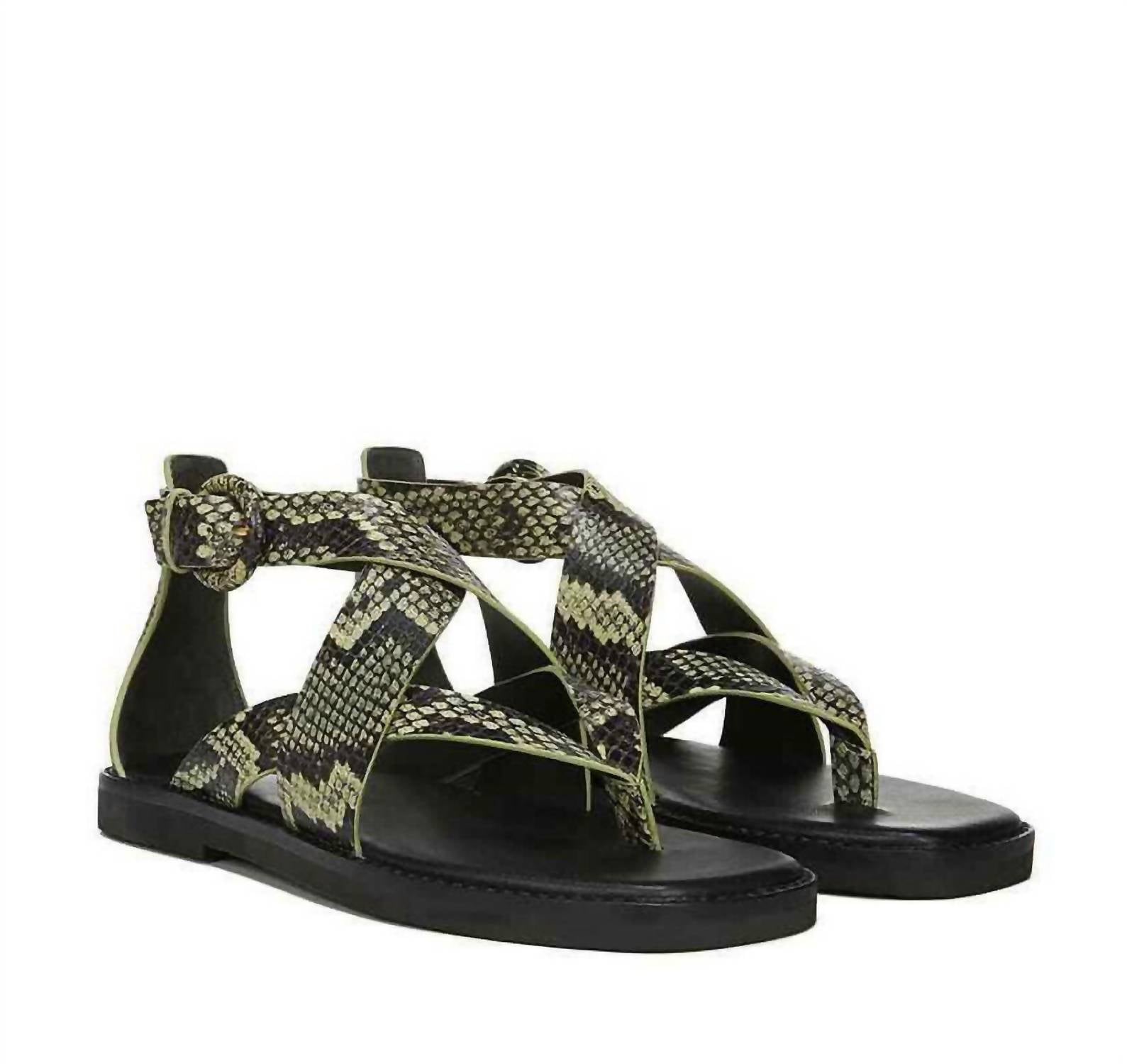 Classicly cute and all-day-wearable. We love this sandal. Vince offers elevated, everyday ease with this flat thong-strap sandal crafted with crisscrossing straps that comfortably wrap the foot. True to size. 3 3/4" strap height Adjustable ankle strap with buckle closure Leather upper and lining/rubber sole Materials 100% calf leather