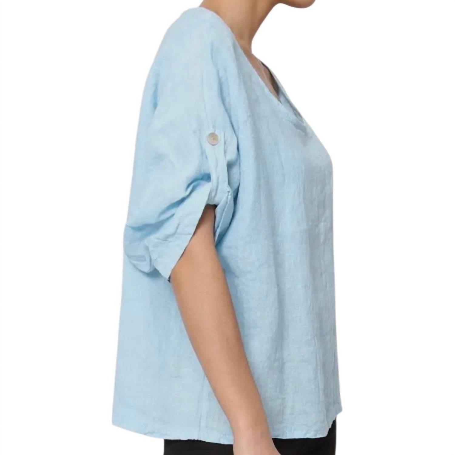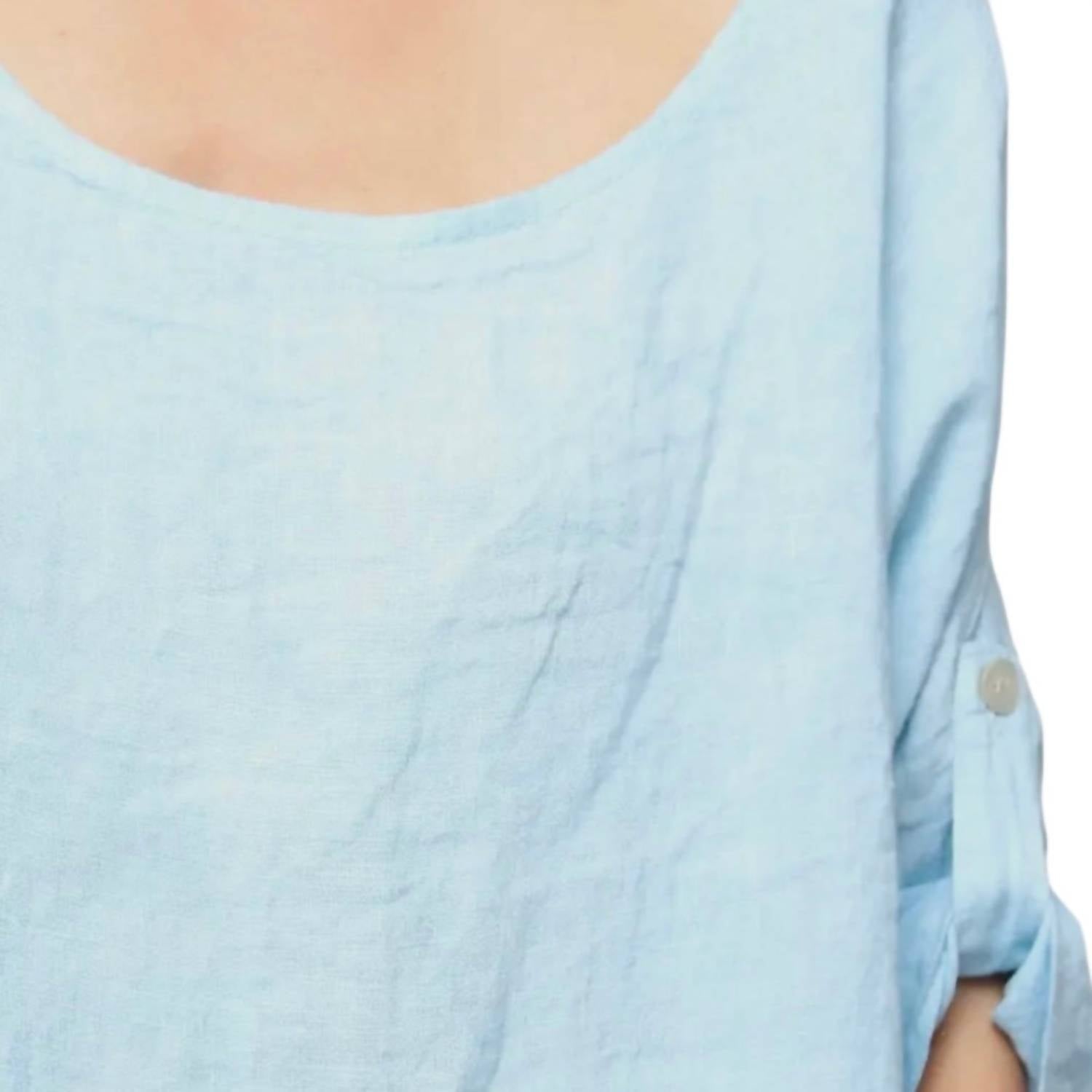 A timeless blouse that will never go out of style. Discover effortless style with the Everyday Linen Top by Made in Italy, crafted for comfort and elegance. Featuring three-quarter sleeves that can be button-tabbed for versatility, this sky blue blouse is made from 100% linen for breathable wear. The flattering scoop neckline and relaxed fit make it ideal for everyday occasions. Originating from Italy, this pull-on design fits US sizes 4 to 12 and is conveniently machine washable.